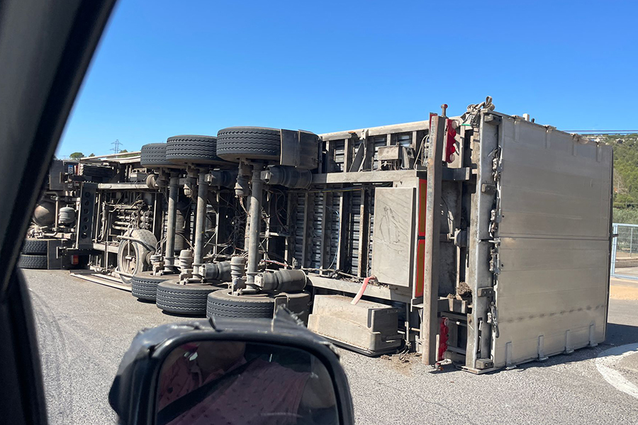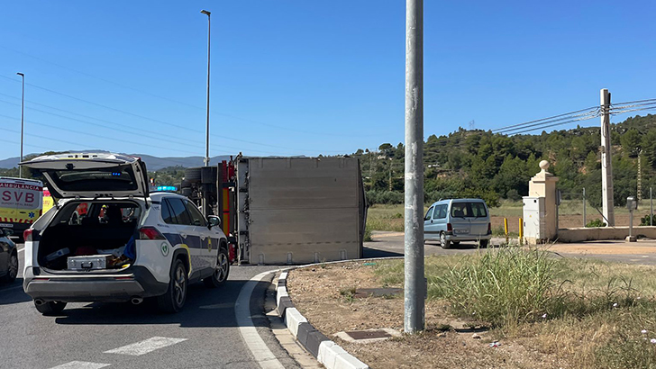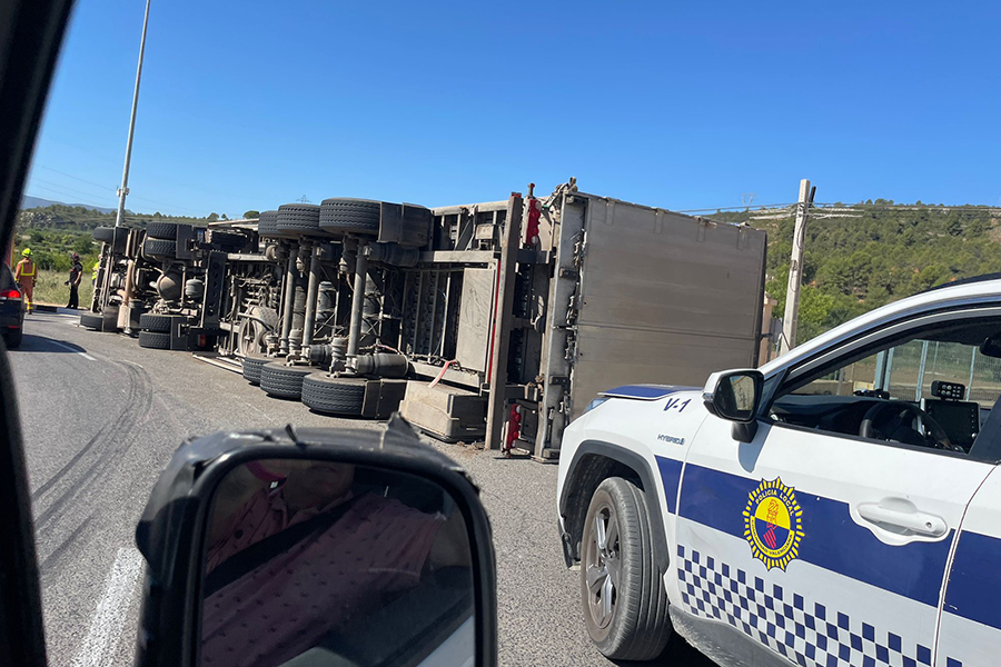 Hace apenas unos minutos se ha producido un accidente a la entrada de Buñol. Un camión ha volcado en la rotonda. Rápidamente han acudido efectivos de la policía local, de la guardia civil y de los bomberos. A la espera de más detalles, dejamos algunas imágenes del suceso.