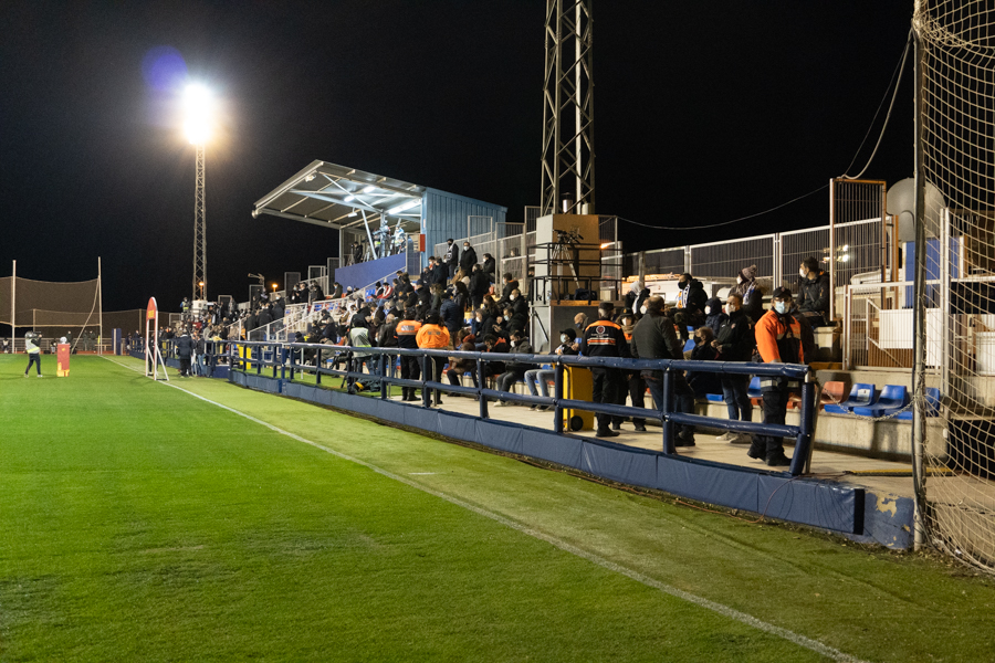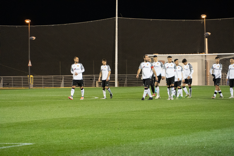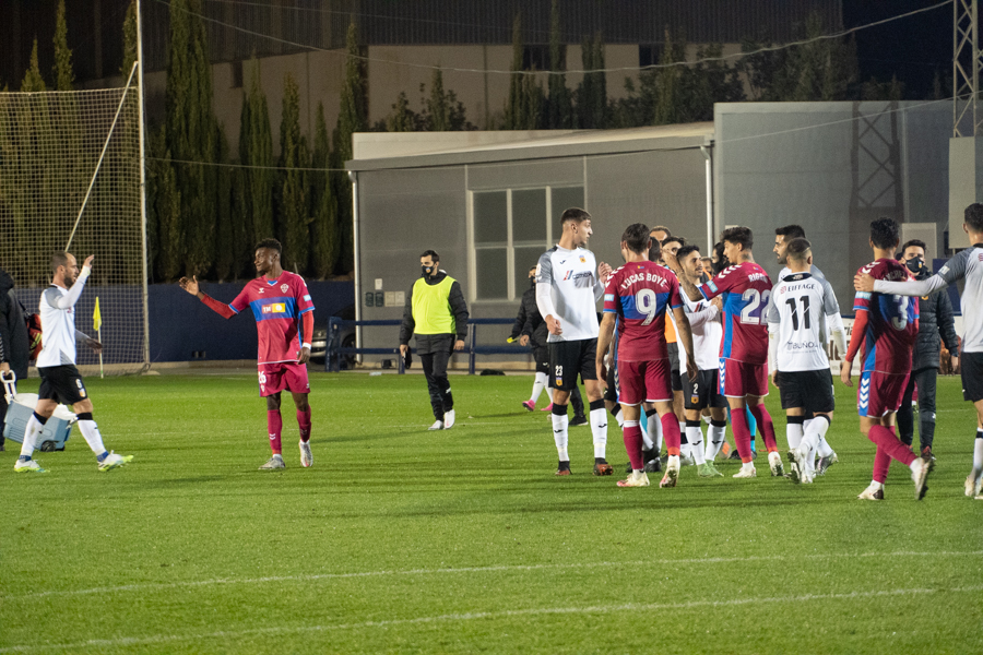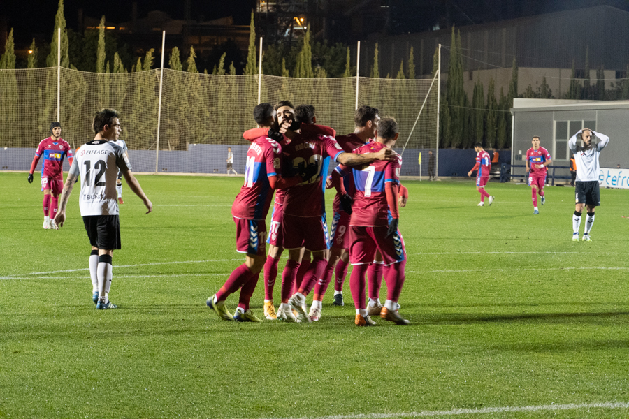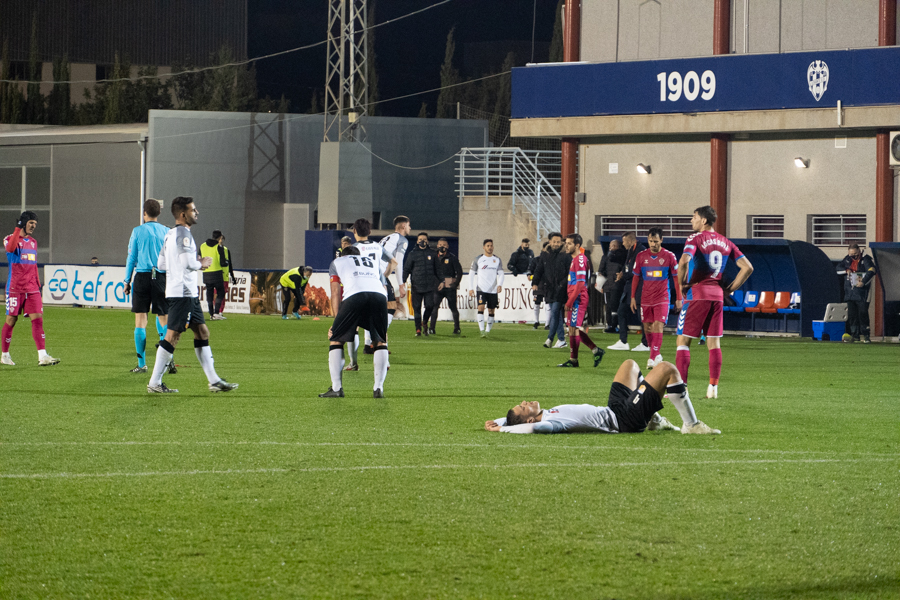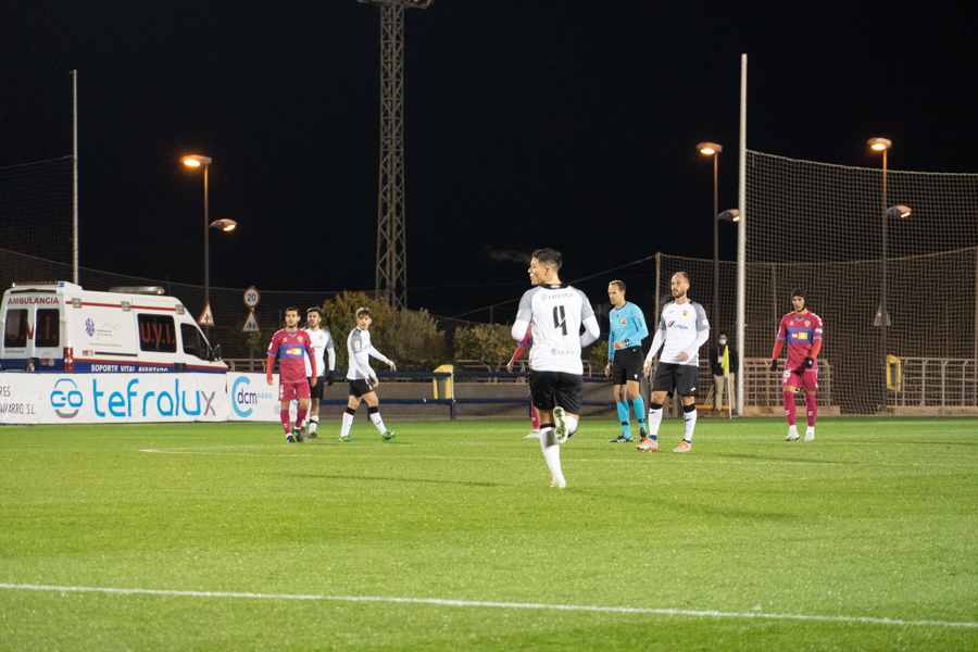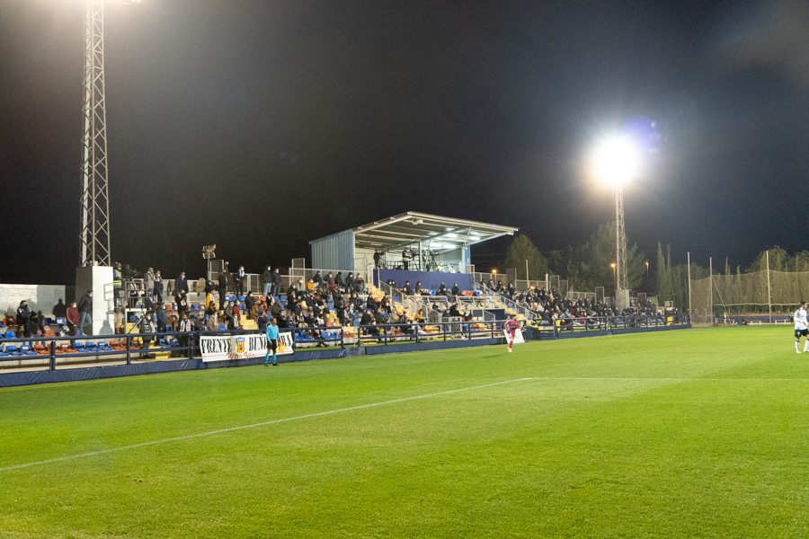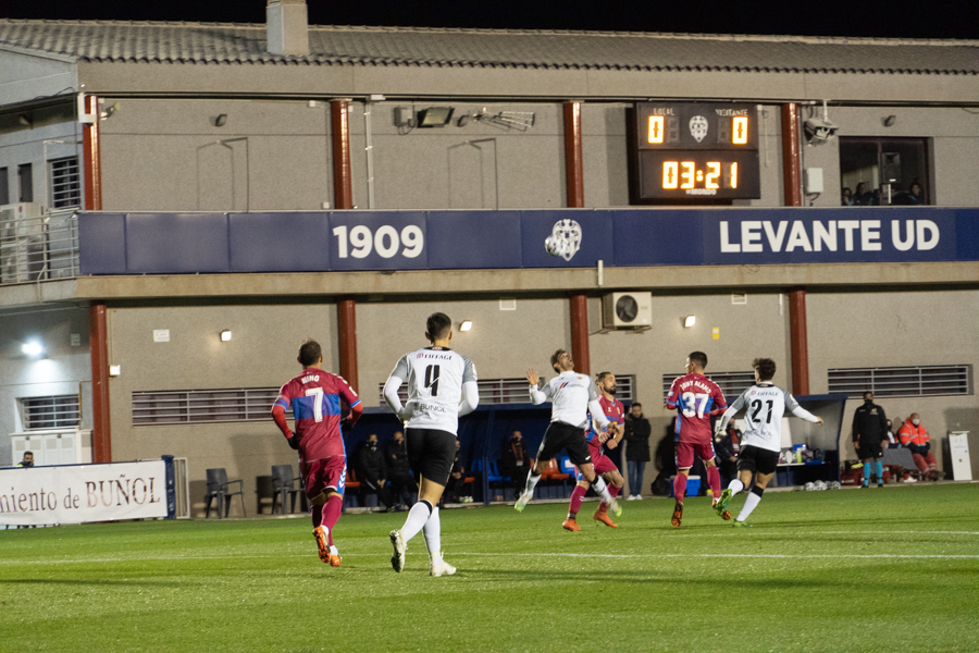 En cuanto al choque. Comenzaba de cara para los de Adrián Ferrandis. Una jugada embarullada después del saque de una falta, hacía que el balón se introdujera en la portería del Elche, después de rebotar en Dani Calvo. La euforia se ha desatado en la ciudad deportiva granota y los 150 aficionados que estaban allí han estallado de júbilo, al igual que han hecho los jugadores y el banquillo blancos.