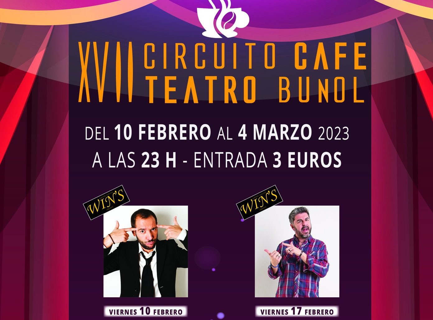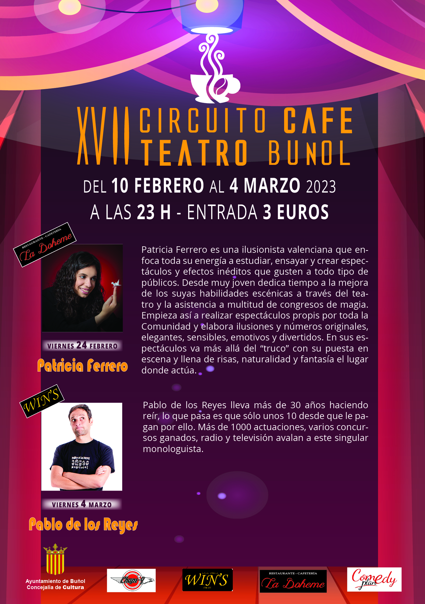 Actuarán en este circuito Manu Baeza, Rafa Forner, Patricia Ferrero y Rafa de los Reyes. El Circuito Café Teatro está organizado por la Concejalía de Juventud del Ayuntamiento de Buñol y cuenta con la colaboración de los bares y pubs, Win’s y La Bohème. Cada viernes por la noche recibirán a los profesionales del humor y de la magia que deleitarán a todos los buñolenses y visitantes con excepcionales espectáculos.