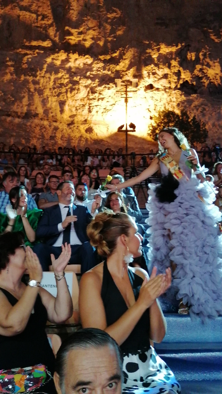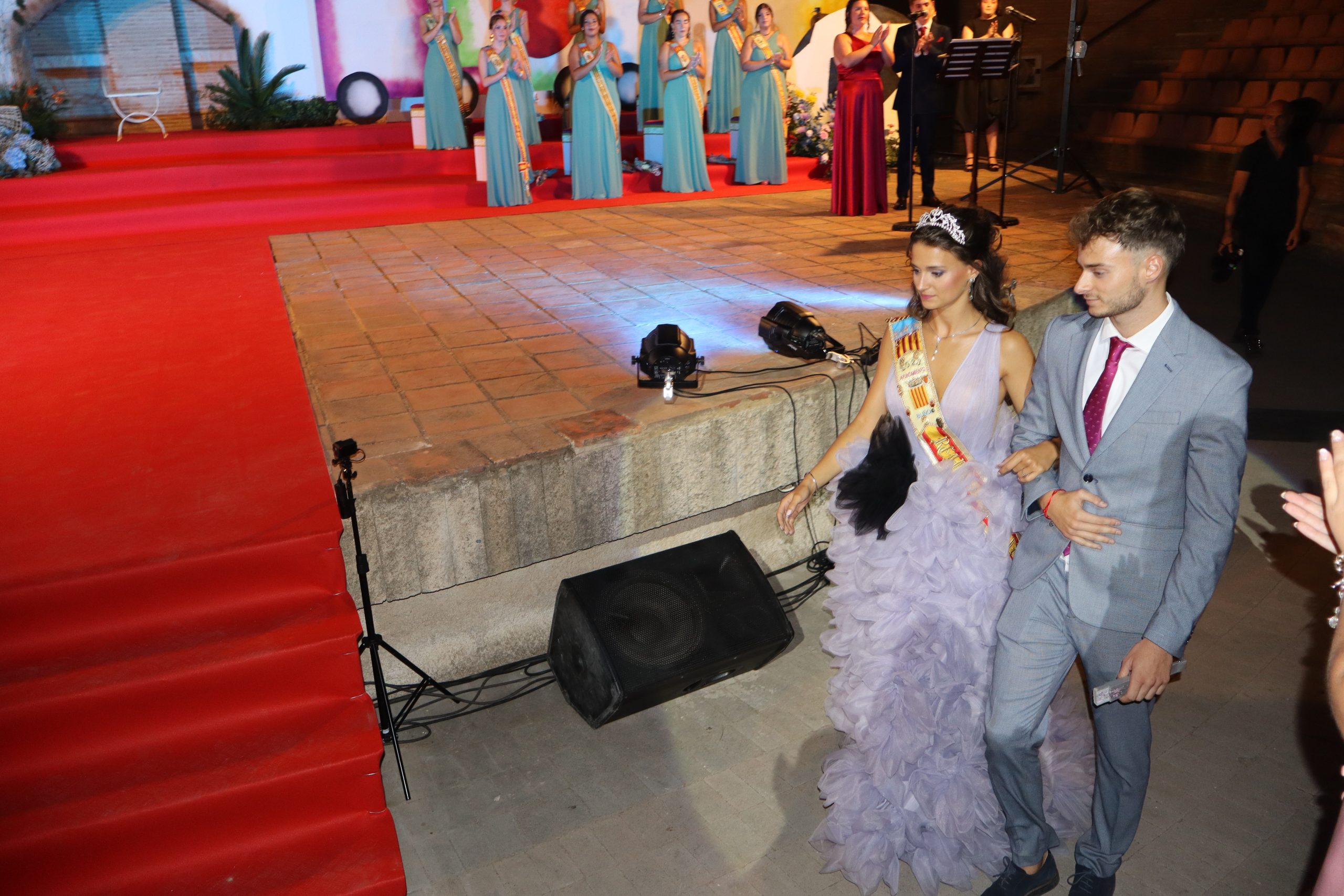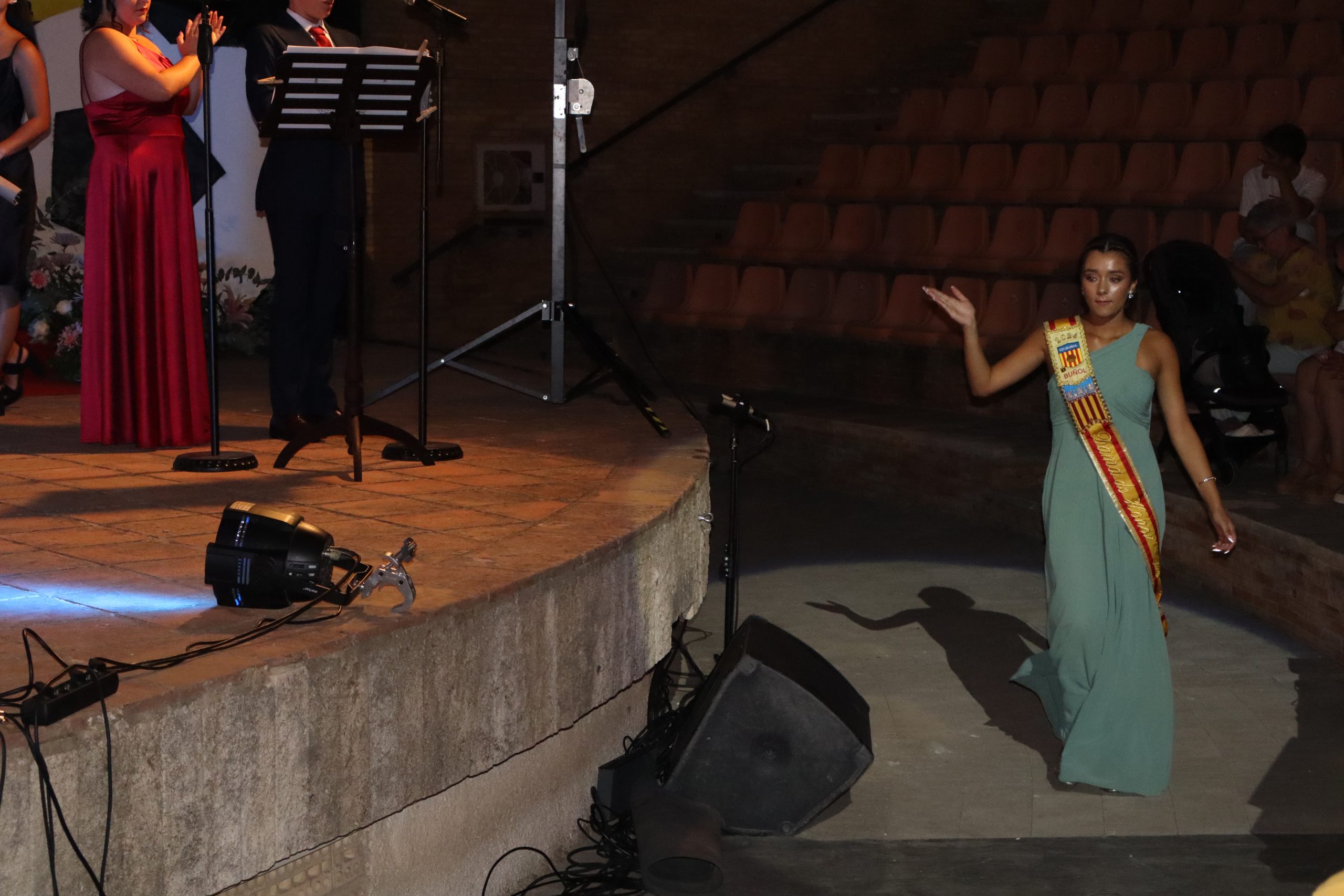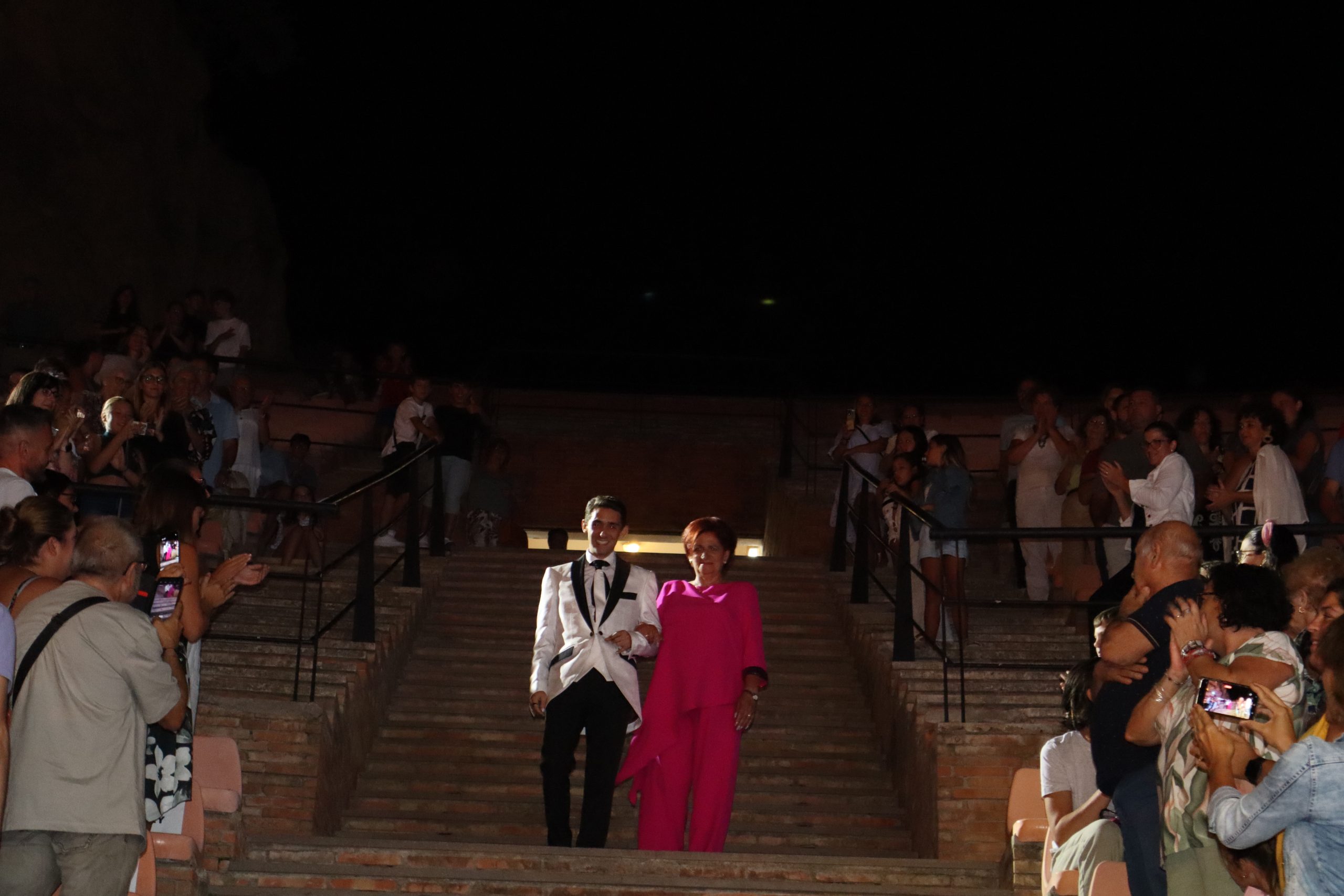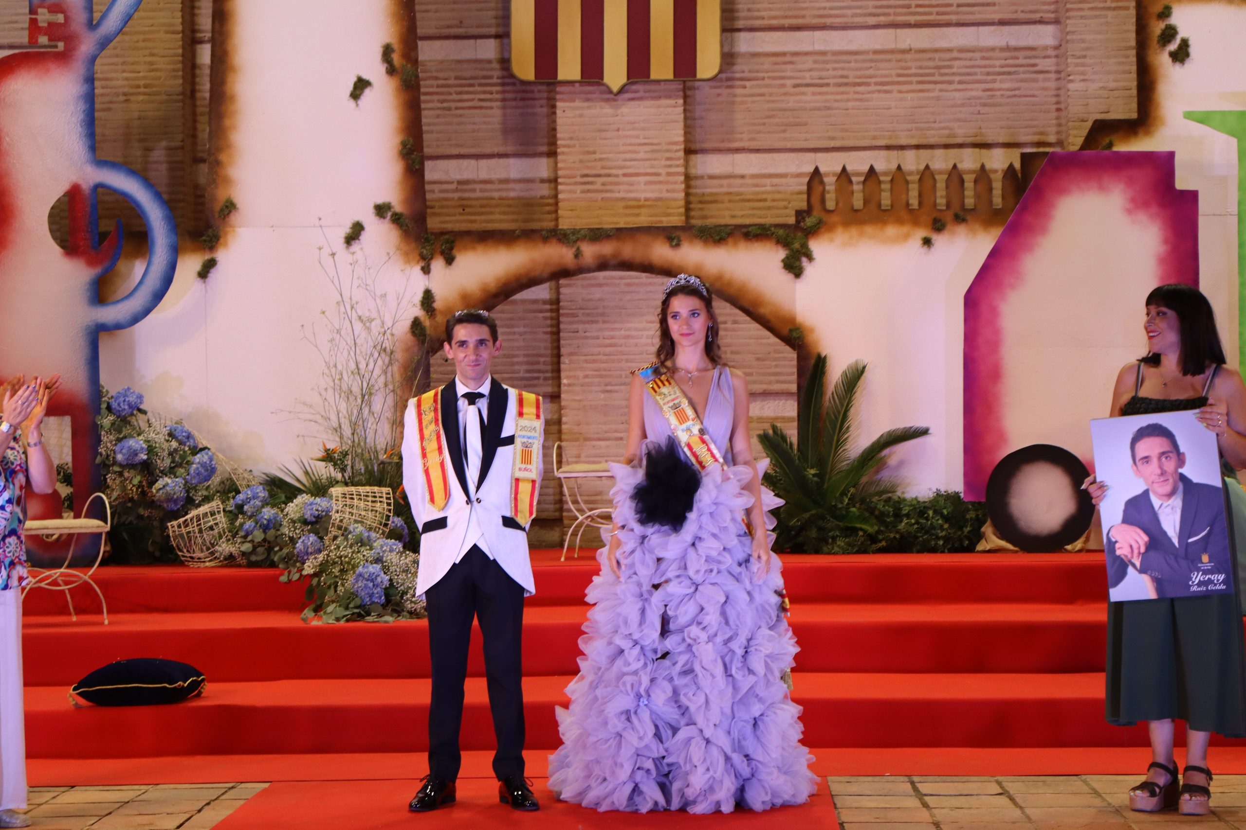 El escenario, se preparó para la ocasión, con los elementos más característicos de las fiestas buñolenses. También ayudó que hubo un maestro de ceremonias que llevó la presentación de manera magistral. Y luego llegaron los momento cumbre. La emotiva despedida de la Reina saliente, Celeste Agustina, que dedicó unas preciosas palabras al abarrotado auditorio. Y luego vino el momento que todos estaban esperando, la bajada por las escaleras de Yeray acompañado de su madre. Fue una bajada larga, intensa, llena de emoción y sentimiento y que estuvo en todo momento acompañada por el aplauso unánime del público. Yeray llegó al escenario y el aplauso se tornó todavía mas intenso y en su cara se veía felicidad y mucha emoción. El protagonista pronunció su primer discurso a las y los vecinos, en el que agradeció el apoyo de su familia y de su eterna amiga Clara Zanón Andrés, pieza fundamental en este paso.