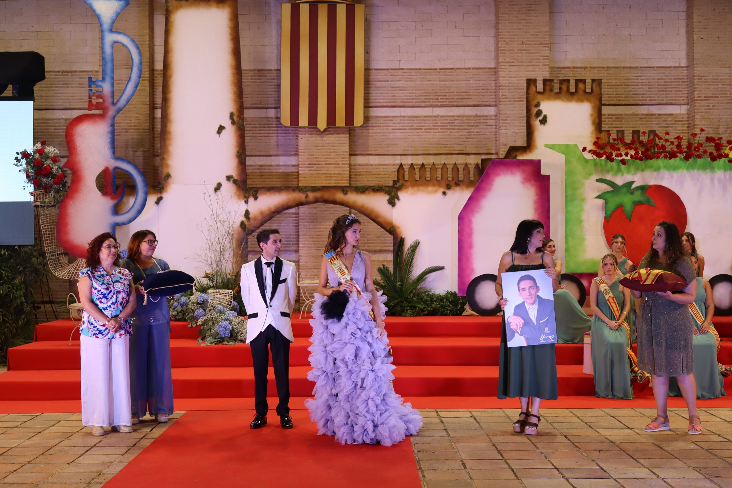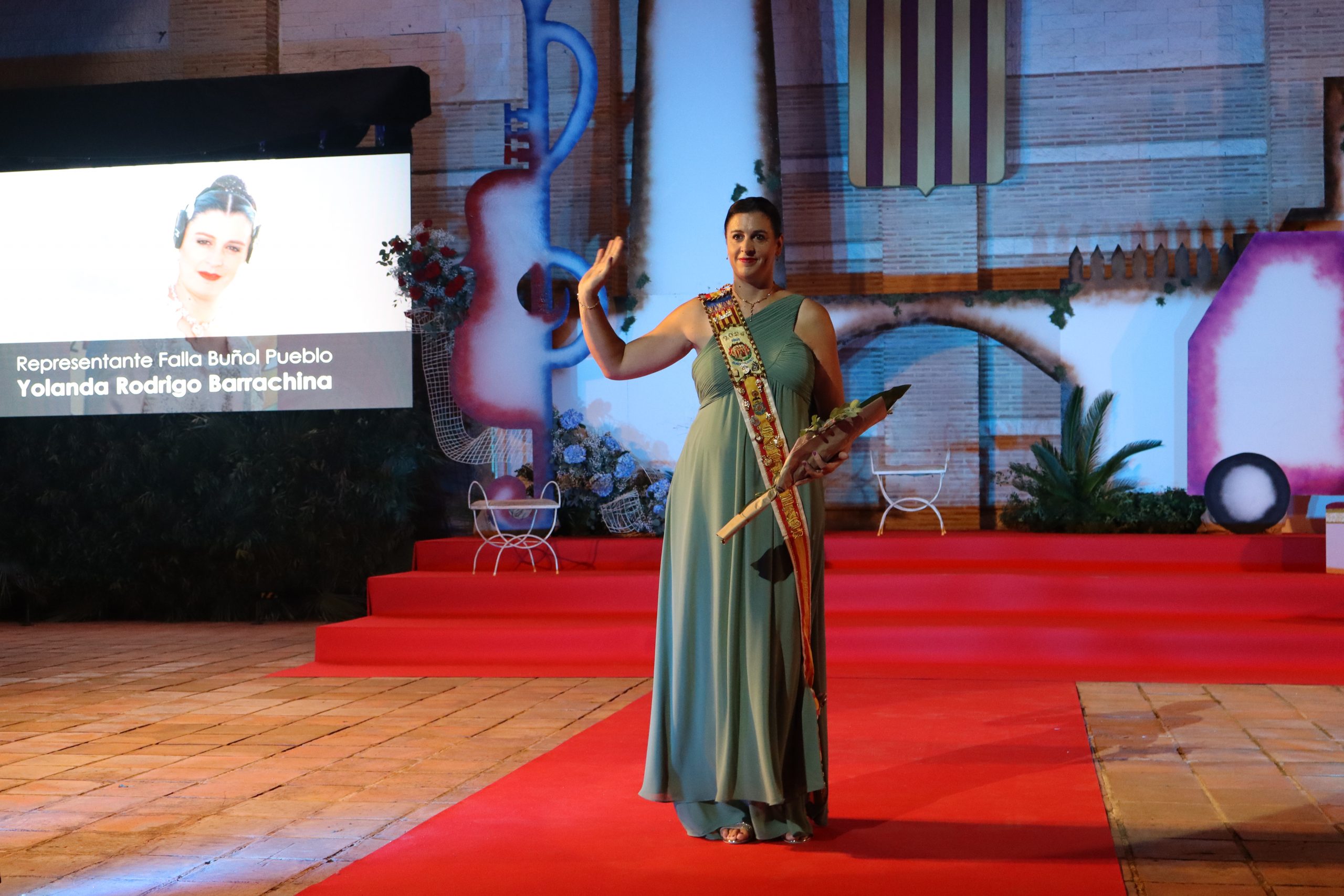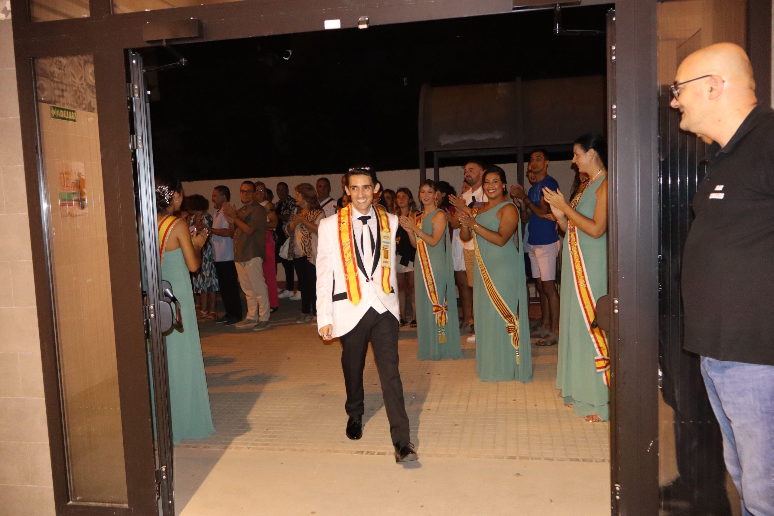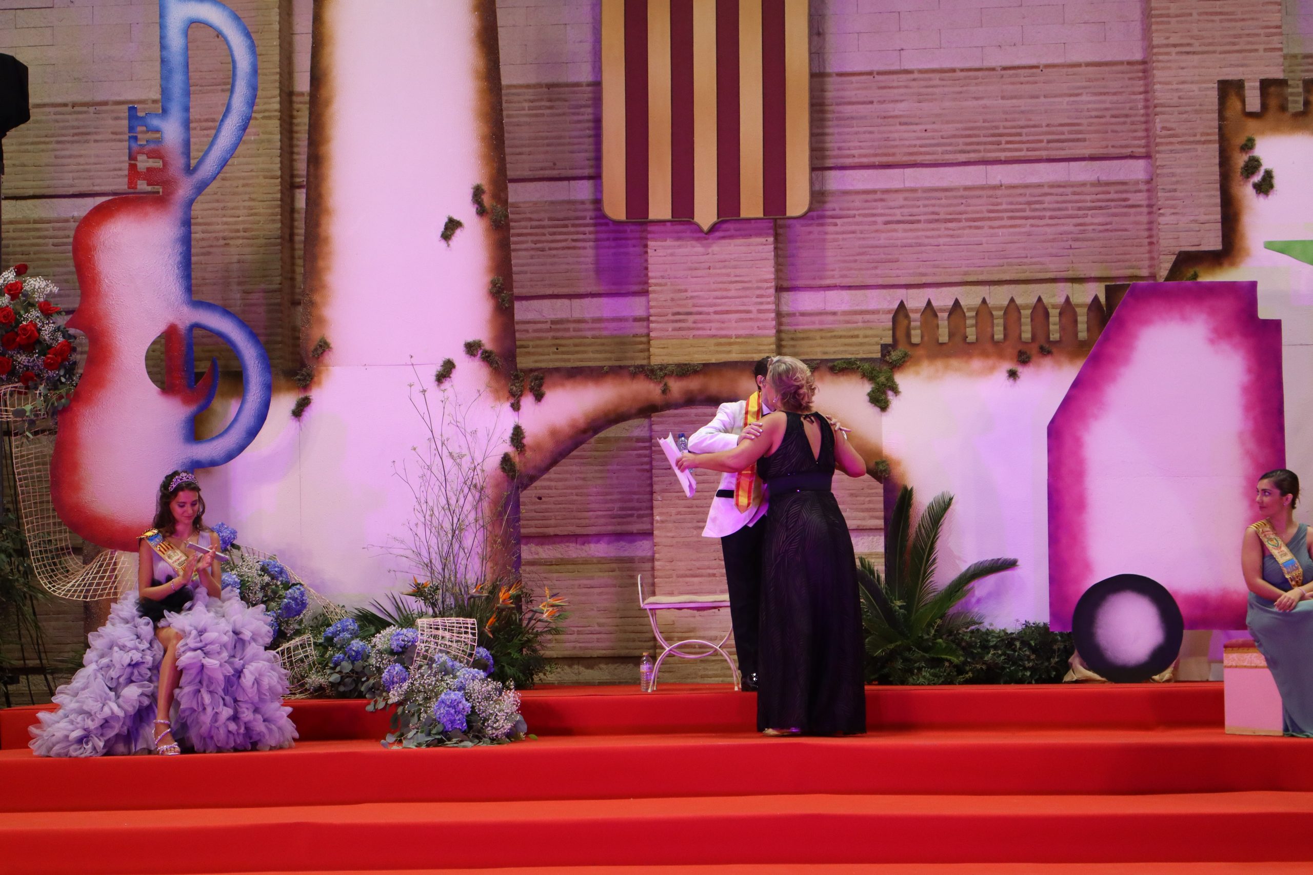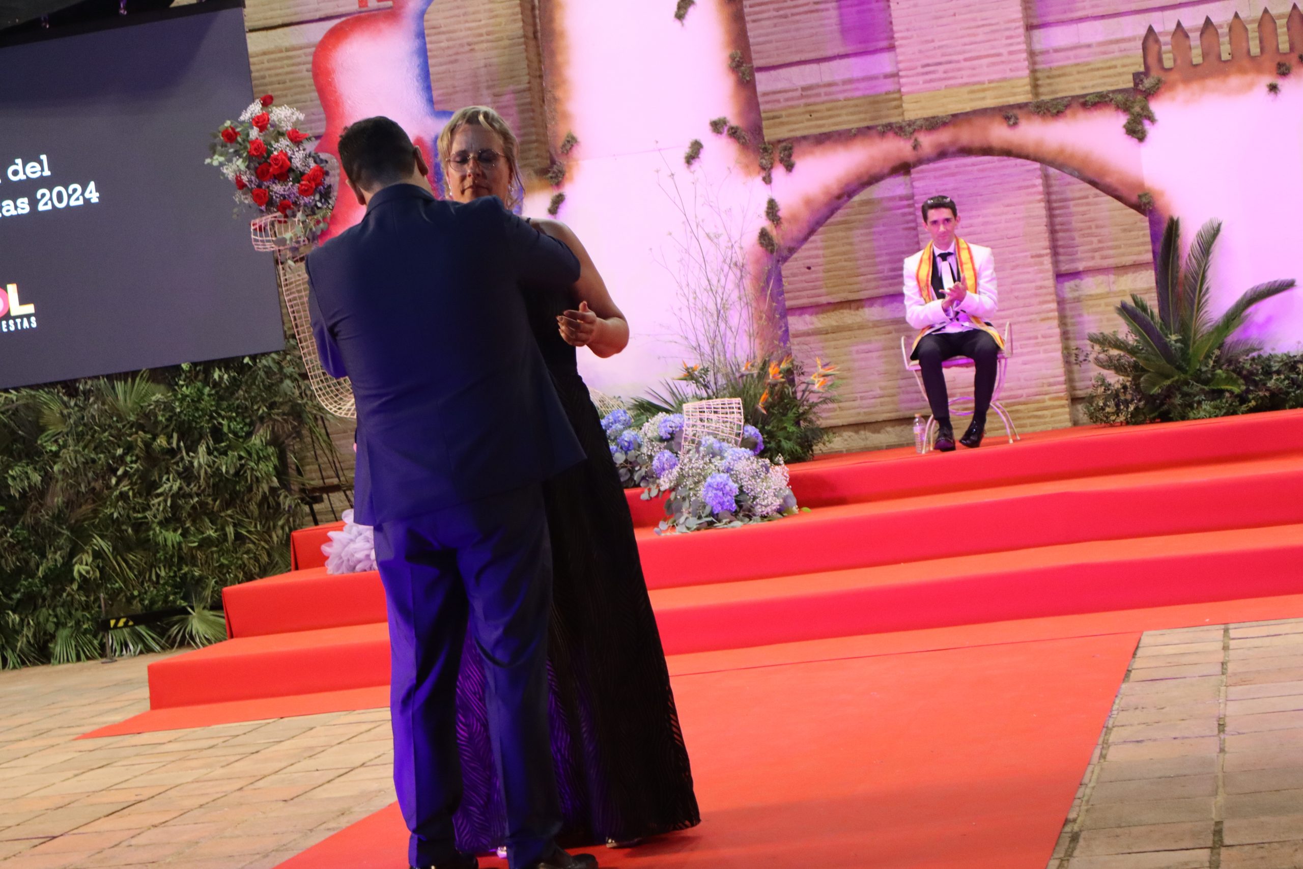 El escenario, se preparó para la ocasión, con los elementos más característicos de las fiestas buñolenses. También ayudó que hubo un maestro de ceremonias que llevó la presentación de manera magistral. Y luego llegaron los momento cumbre. La emotiva despedida de la Reina saliente, Celeste Agustina, que dedicó unas preciosas palabras al abarrotado auditorio. Y luego vino el momento que todos estaban esperando, la bajada por las escaleras de Yeray acompañado de su madre. Fue una bajada larga, intensa, llena de emoción y sentimiento y que estuvo en todo momento acompañada por el aplauso unánime del público. Yeray llegó al escenario y el aplauso se tornó todavía mas intenso y en su cara se veía felicidad y mucha emoción. El protagonista pronunció su primer discurso a las y los vecinos, en el que agradeció el apoyo de su familia y de su eterna amiga Clara Zanón Andrés, pieza fundamental en este paso.