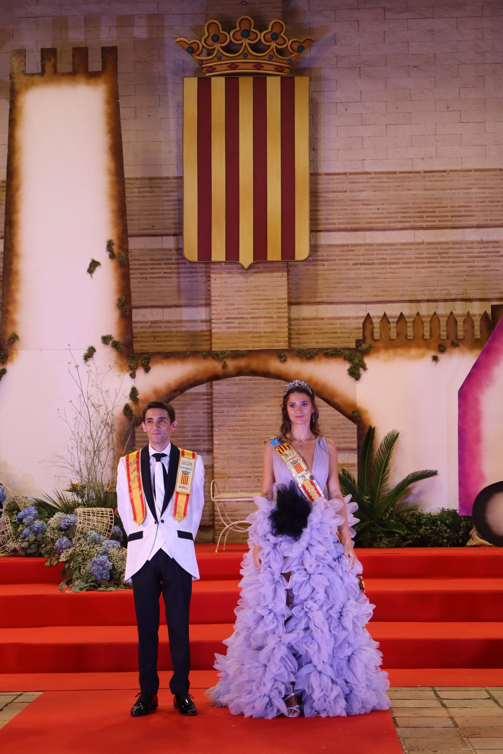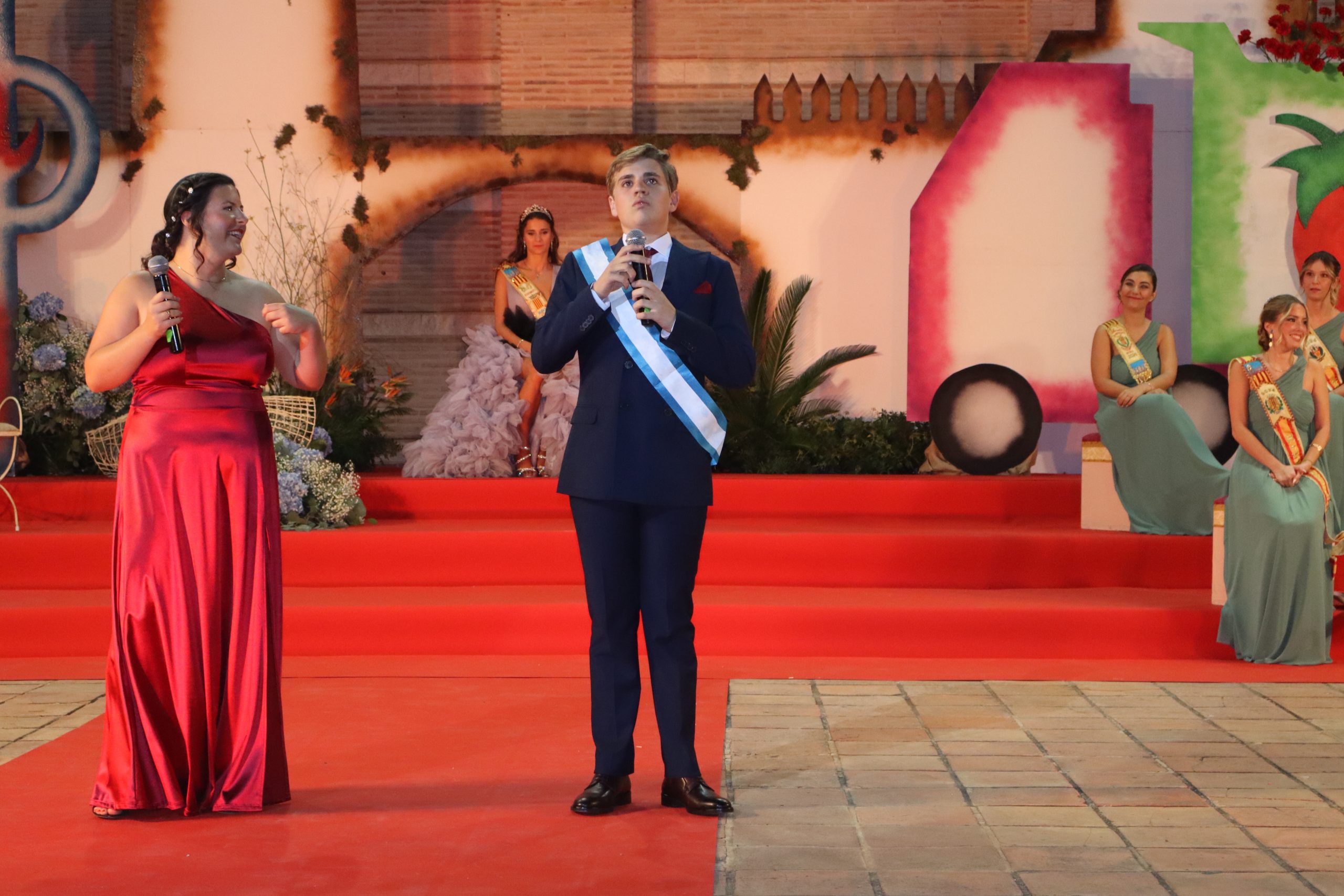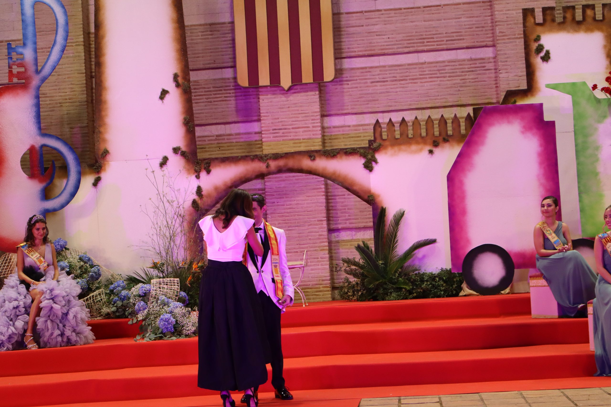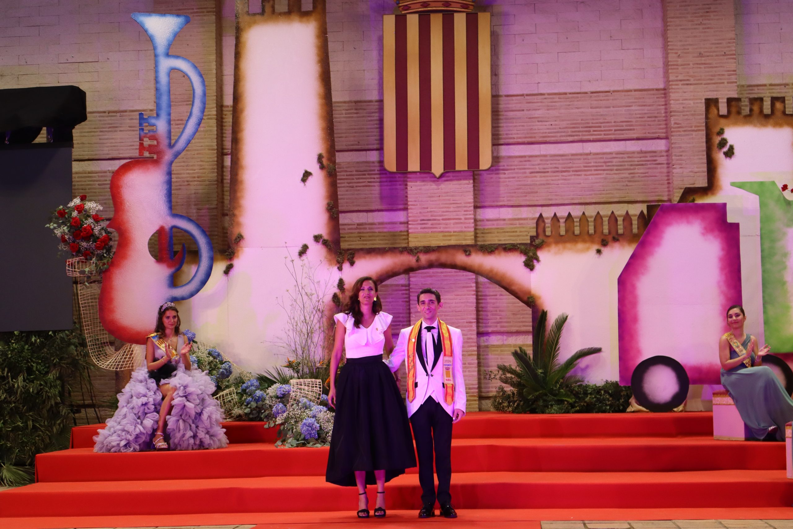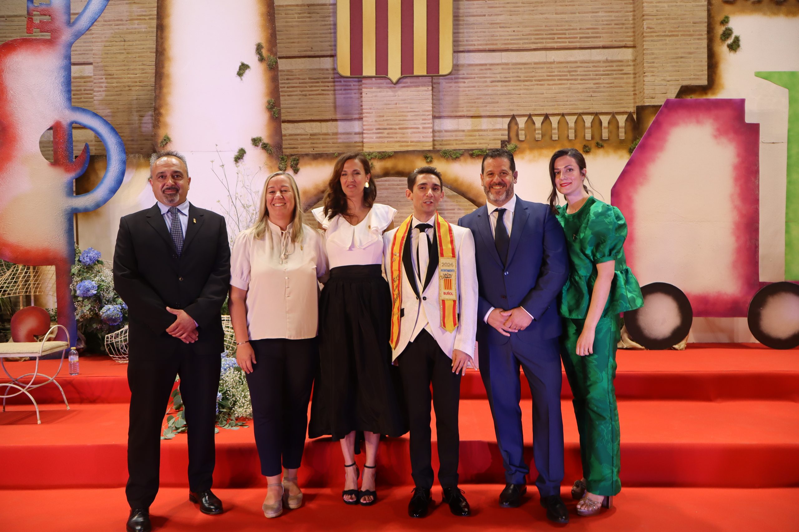 El escenario, se preparó para la ocasión, con los elementos más característicos de las fiestas buñolenses. También ayudó que hubo un maestro de ceremonias que llevó la presentación de manera magistral. Y luego llegaron los momento cumbre. La emotiva despedida de la Reina saliente, Celeste Agustina, que dedicó unas preciosas palabras al abarrotado auditorio. Y luego vino el momento que todos estaban esperando, la bajada por las escaleras de Yeray acompañado de su madre. Fue una bajada larga, intensa, llena de emoción y sentimiento y que estuvo en todo momento acompañada por el aplauso unánime del público. Yeray llegó al escenario y el aplauso se tornó todavía mas intenso y en su cara se veía felicidad y mucha emoción. El protagonista pronunció su primer discurso a las y los vecinos, en el que agradeció el apoyo de su familia y de su eterna amiga Clara Zanón Andrés, pieza fundamental en este paso.