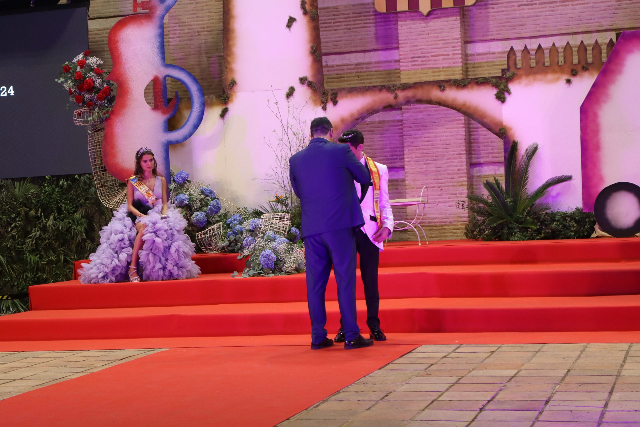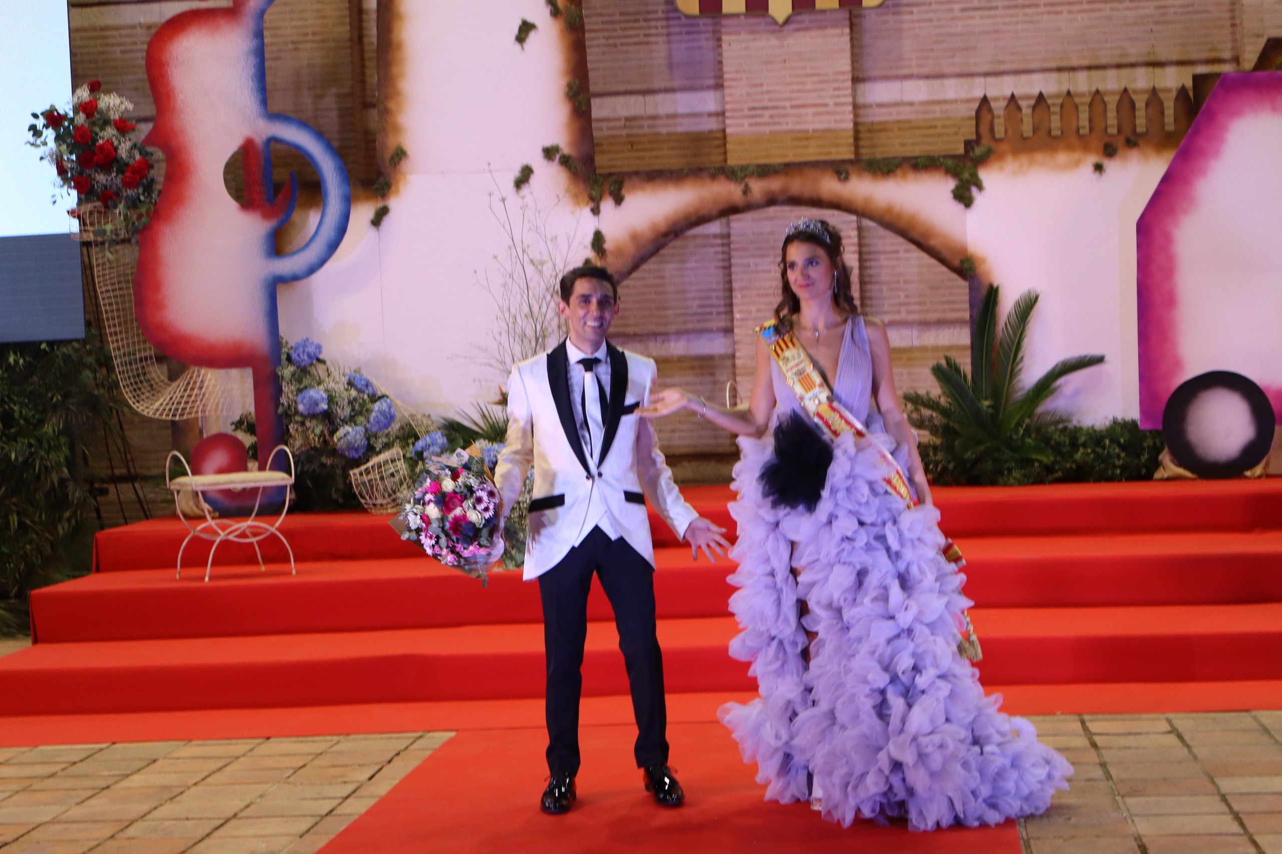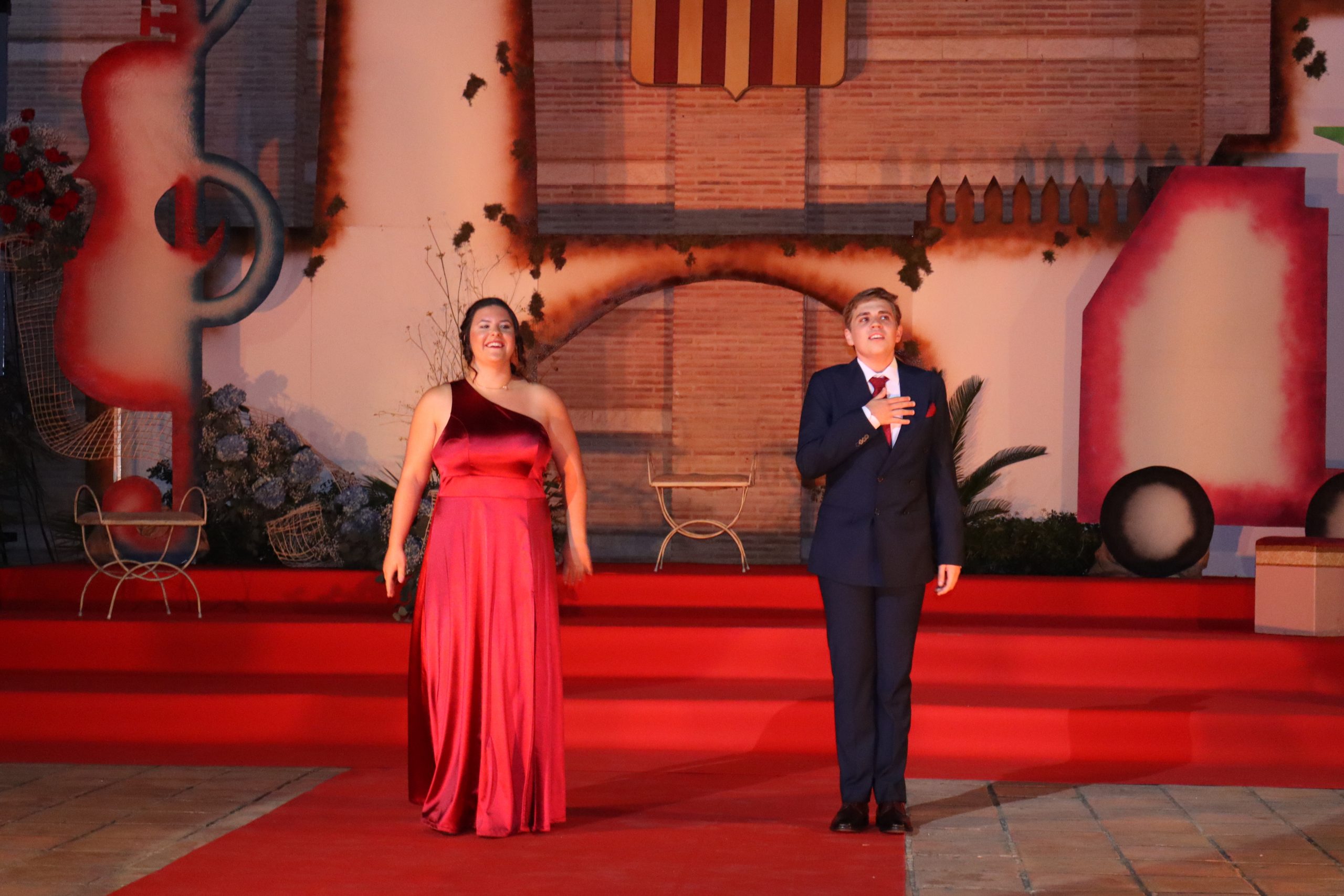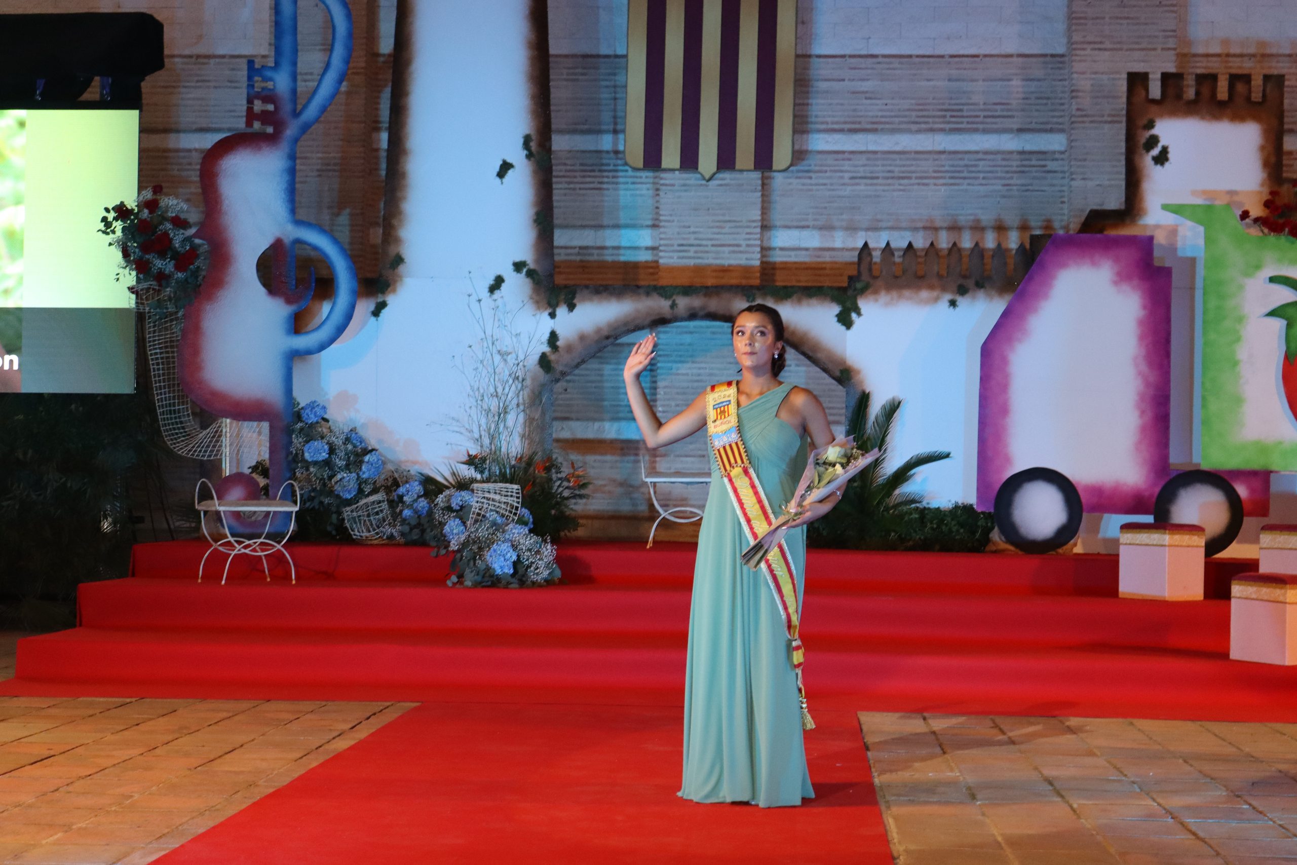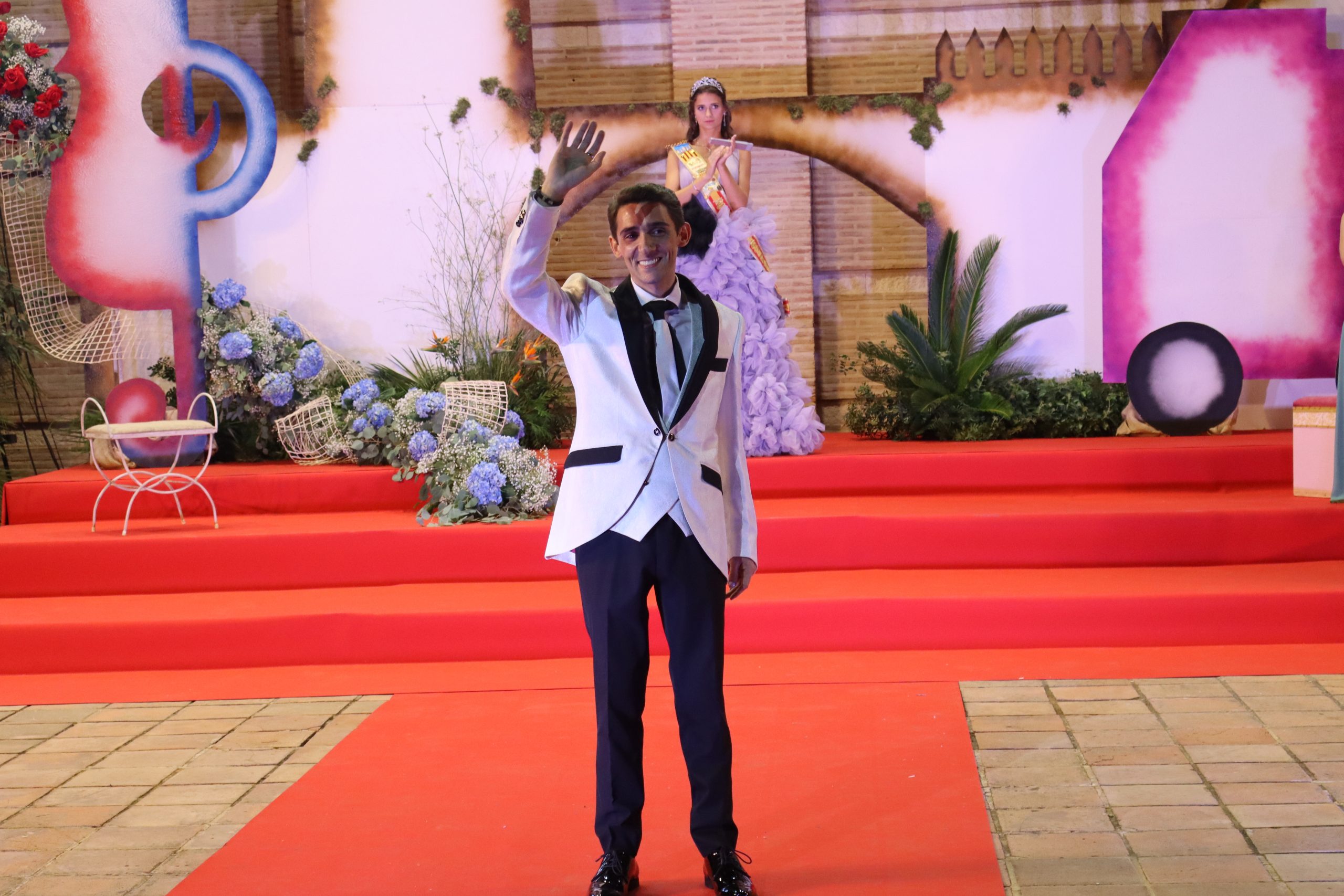 El escenario, se preparó para la ocasión, con los elementos más característicos de las fiestas buñolenses. También ayudó que hubo un maestro de ceremonias que llevó la presentación de manera magistral. Y luego llegaron los momento cumbre. La emotiva despedida de la Reina saliente, Celeste Agustina, que dedicó unas preciosas palabras al abarrotado auditorio. Y luego vino el momento que todos estaban esperando, la bajada por las escaleras de Yeray acompañado de su madre. Fue una bajada larga, intensa, llena de emoción y sentimiento y que estuvo en todo momento acompañada por el aplauso unánime del público. Yeray llegó al escenario y el aplauso se tornó todavía mas intenso y en su cara se veía felicidad y mucha emoción. El protagonista pronunció su primer discurso a las y los vecinos, en el que agradeció el apoyo de su familia y de su eterna amiga Clara Zanón Andrés, pieza fundamental en este paso.