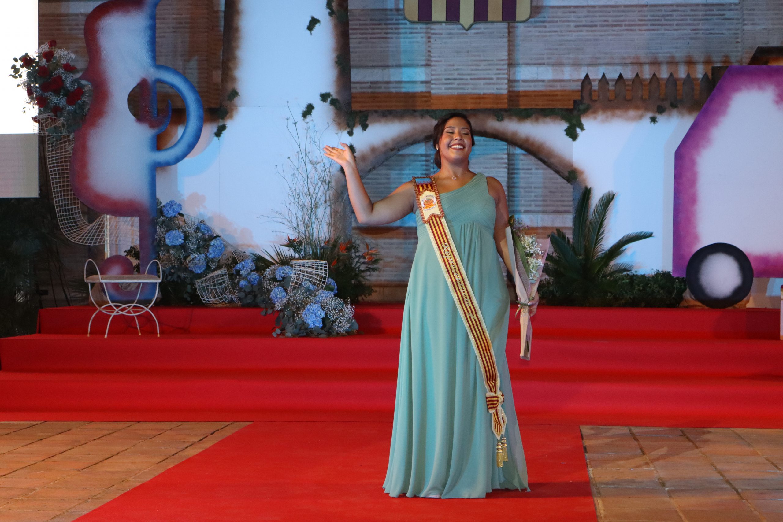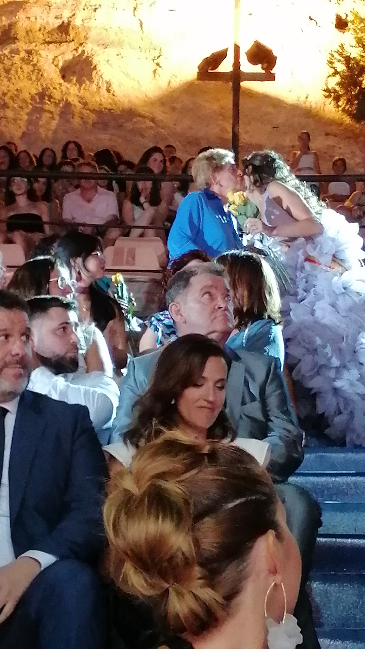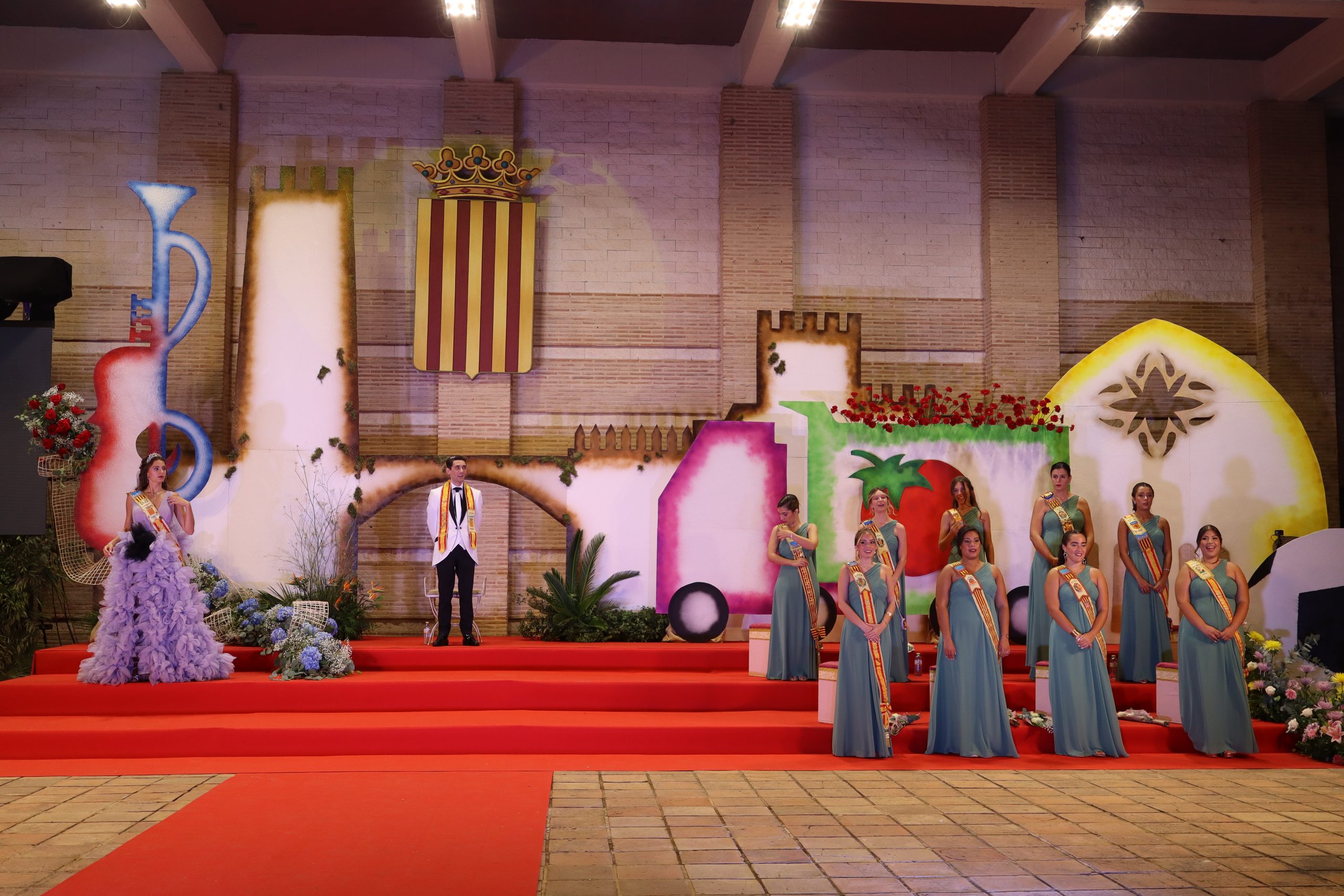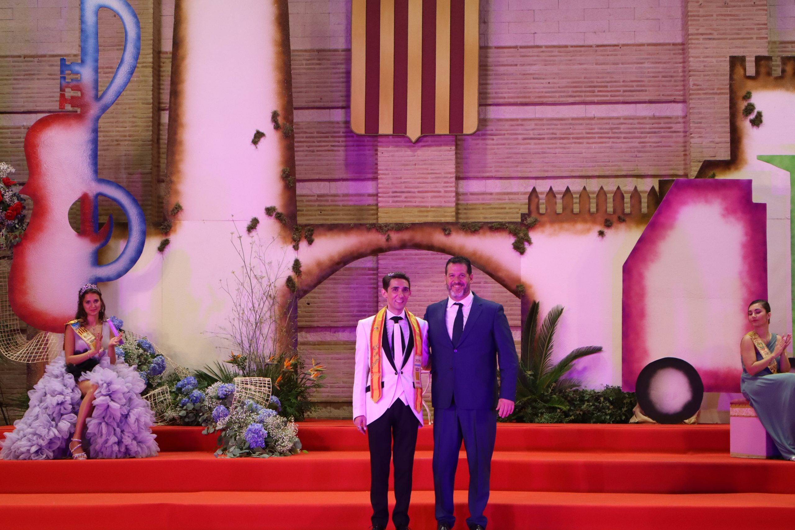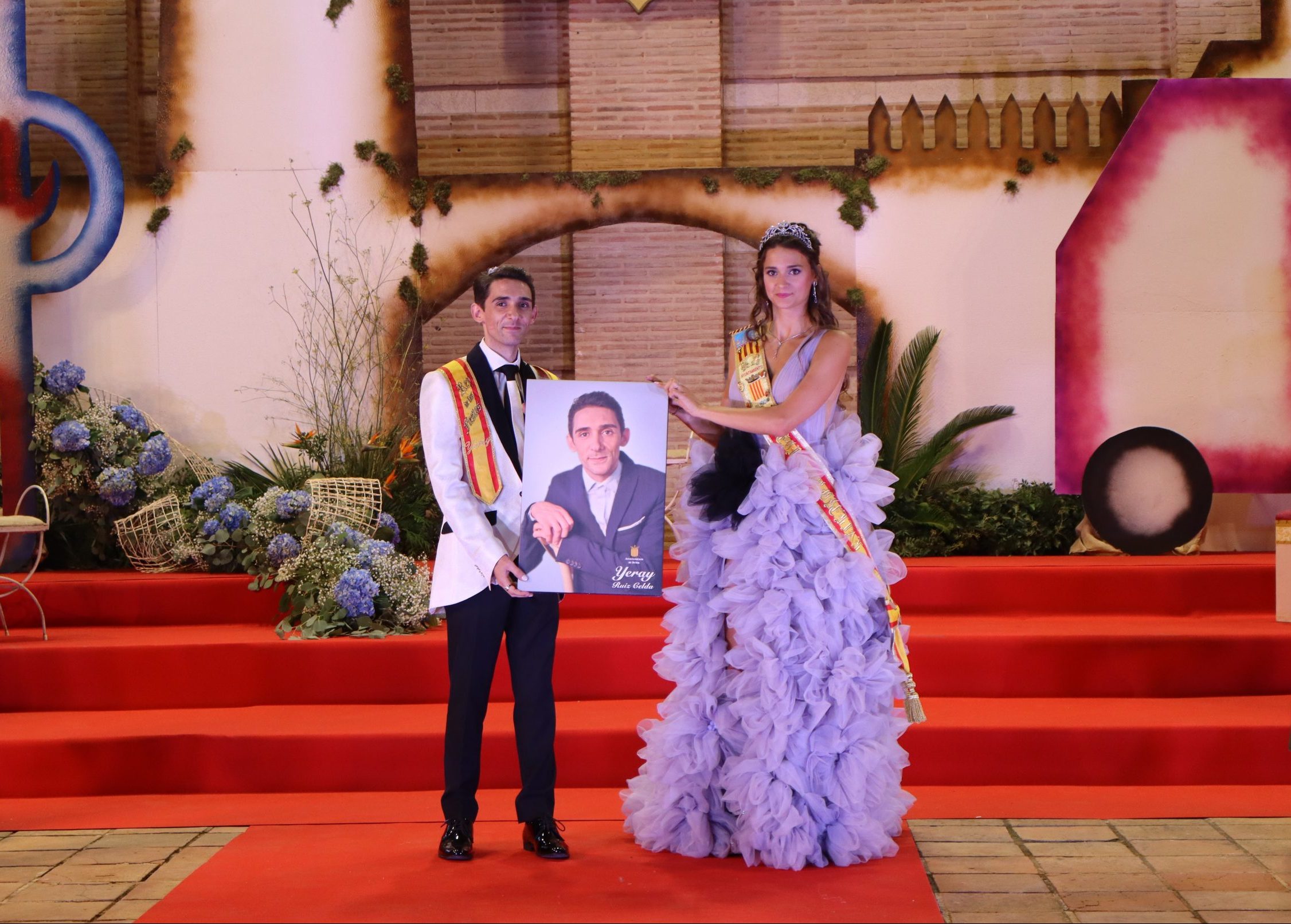 El escenario, se preparó para la ocasión, con los elementos más característicos de las fiestas buñolenses. También ayudó que hubo un maestro de ceremonias que llevó la presentación de manera magistral. Y luego llegaron los momento cumbre. La emotiva despedida de la Reina saliente, Celeste Agustina, que dedicó unas preciosas palabras al abarrotado auditorio. Y luego vino el momento que todos estaban esperando, la bajada por las escaleras de Yeray acompañado de su madre. Fue una bajada larga, intensa, llena de emoción y sentimiento y que estuvo en todo momento acompañada por el aplauso unánime del público. Yeray llegó al escenario y el aplauso se tornó todavía mas intenso y en su cara se veía felicidad y mucha emoción. El protagonista pronunció su primer discurso a las y los vecinos, en el que agradeció el apoyo de su familia y de su eterna amiga Clara Zanón Andrés, pieza fundamental en este paso.