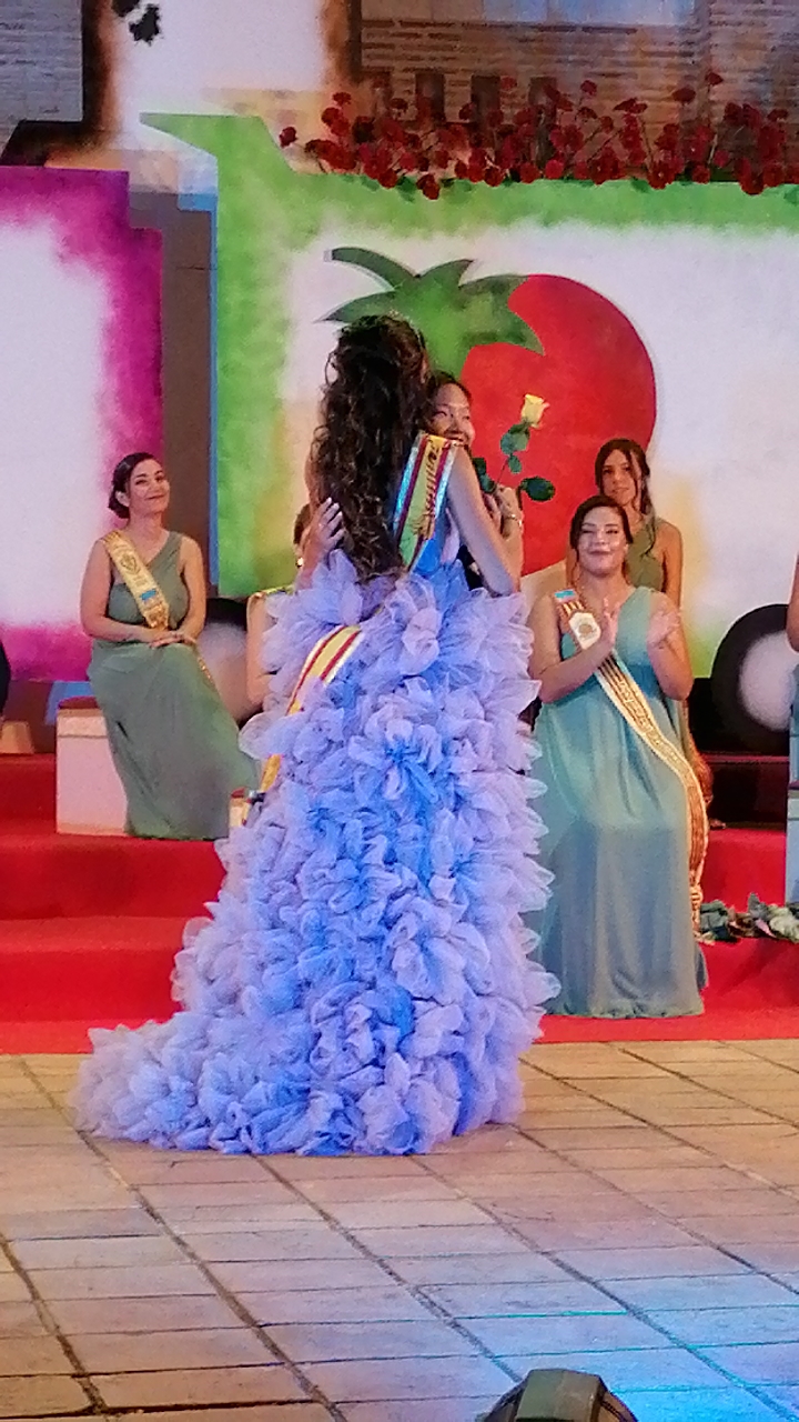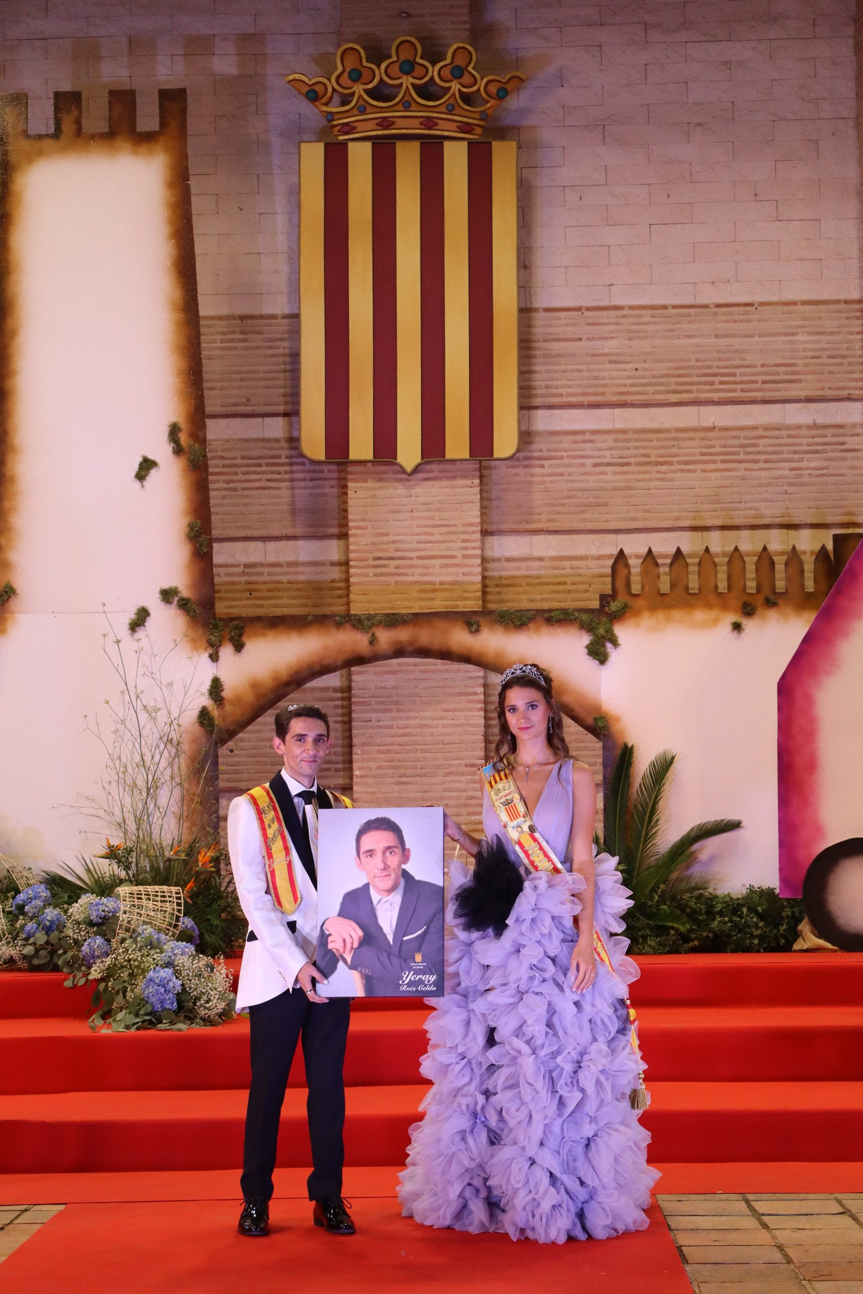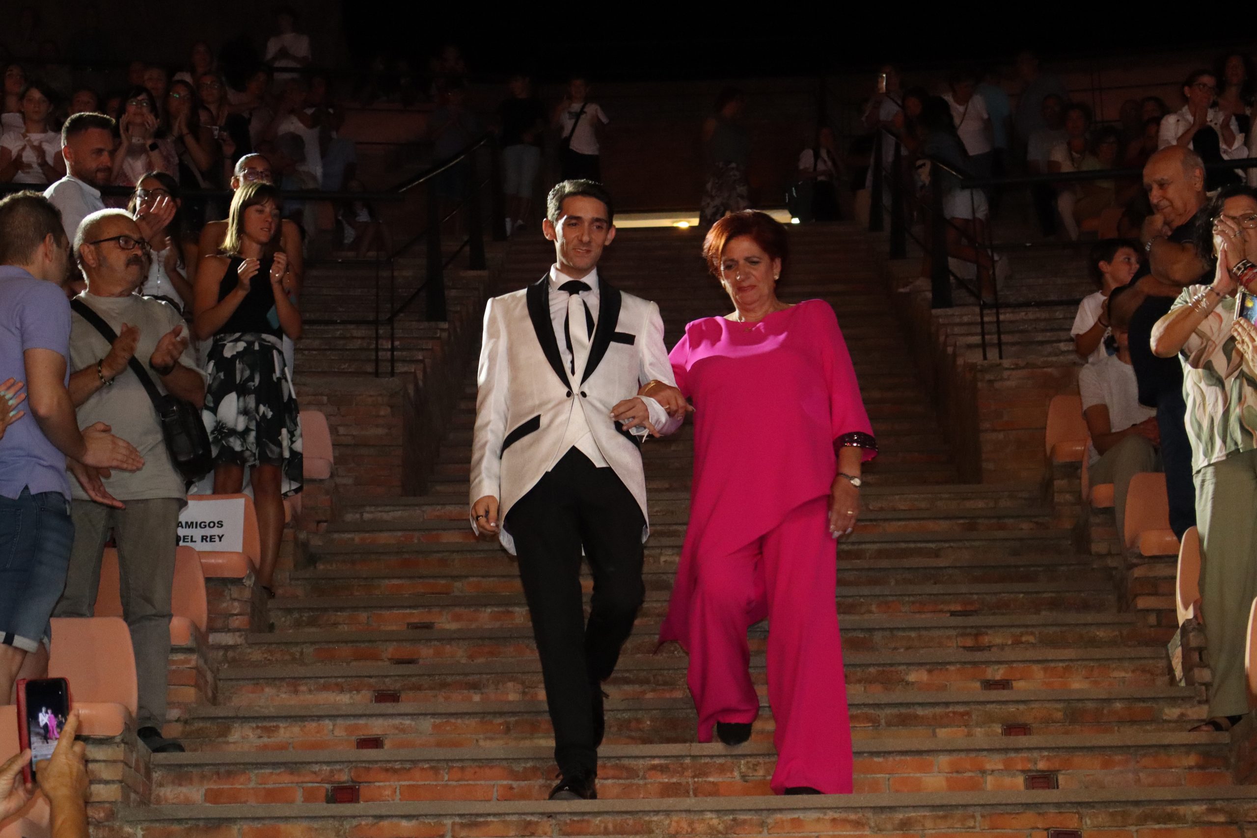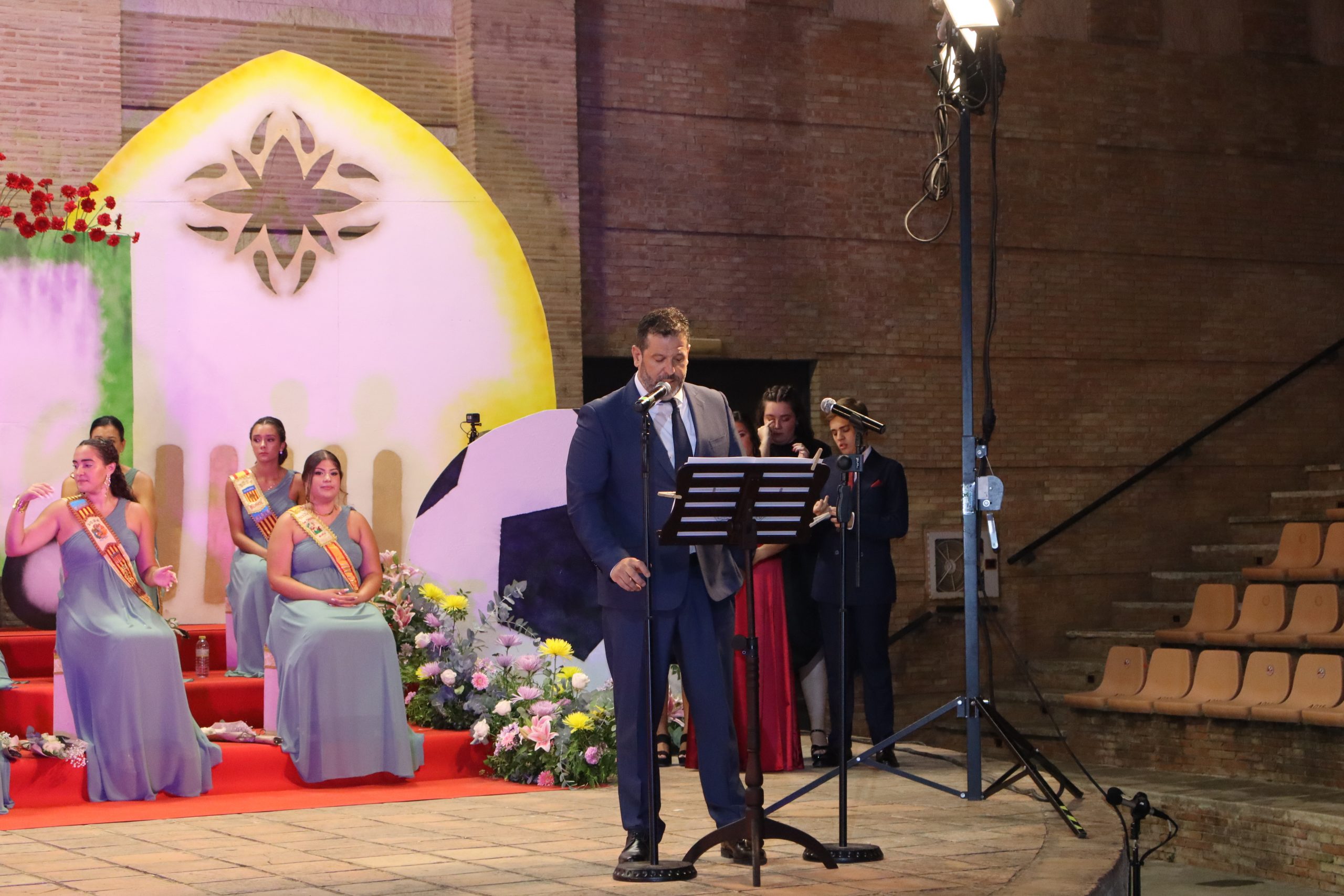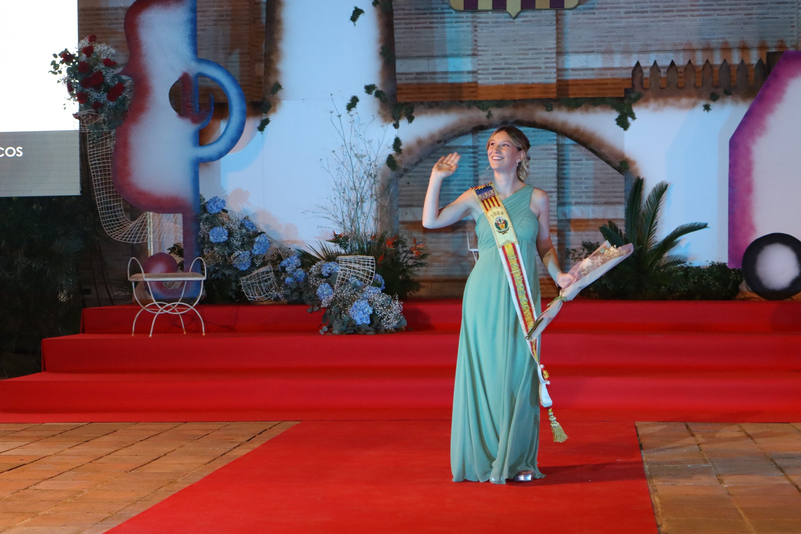 El escenario, se preparó para la ocasión, con los elementos más característicos de las fiestas buñolenses. También ayudó que hubo un maestro de ceremonias que llevó la presentación de manera magistral. Y luego llegaron los momento cumbre. La emotiva despedida de la Reina saliente, Celeste Agustina, que dedicó unas preciosas palabras al abarrotado auditorio. Y luego vino el momento que todos estaban esperando, la bajada por las escaleras de Yeray acompañado de su madre. Fue una bajada larga, intensa, llena de emoción y sentimiento y que estuvo en todo momento acompañada por el aplauso unánime del público. Yeray llegó al escenario y el aplauso se tornó todavía mas intenso y en su cara se veía felicidad y mucha emoción. El protagonista pronunció su primer discurso a las y los vecinos, en el que agradeció el apoyo de su familia y de su eterna amiga Clara Zanón Andrés, pieza fundamental en este paso.