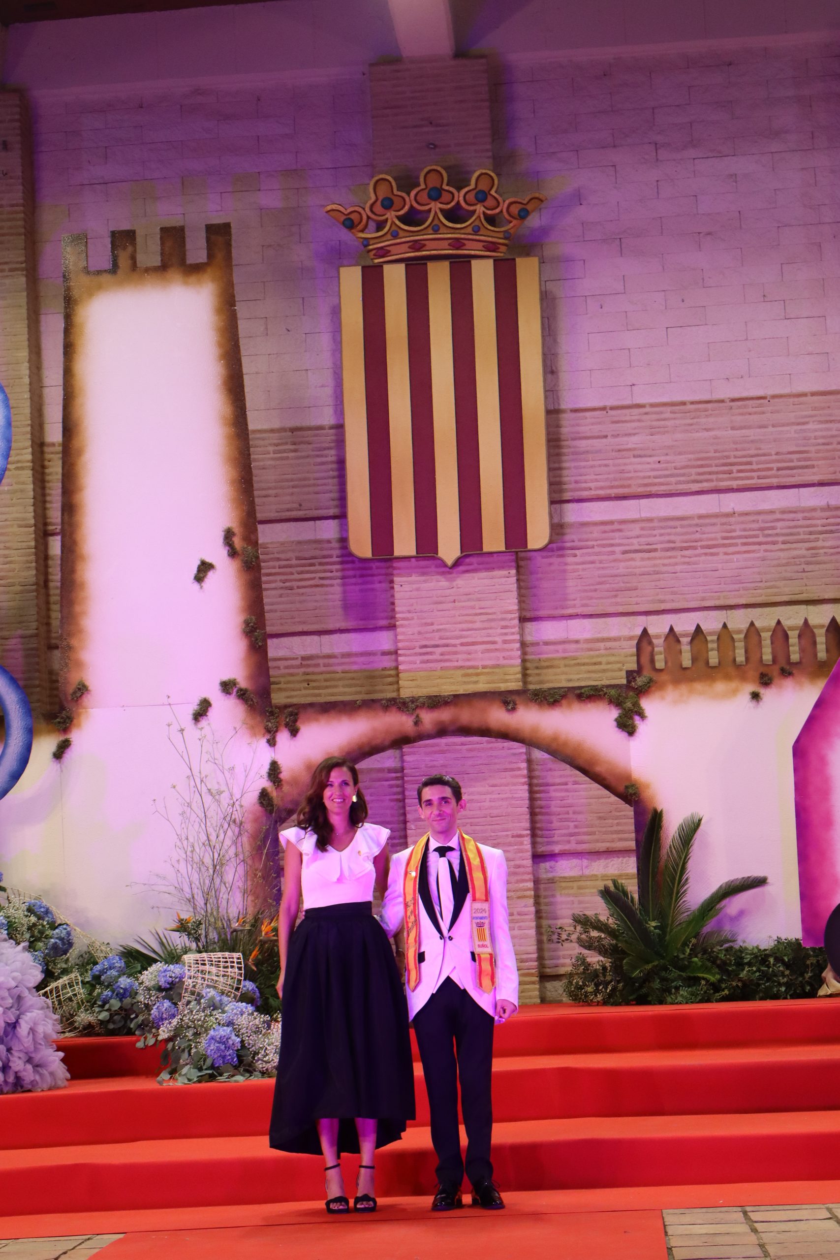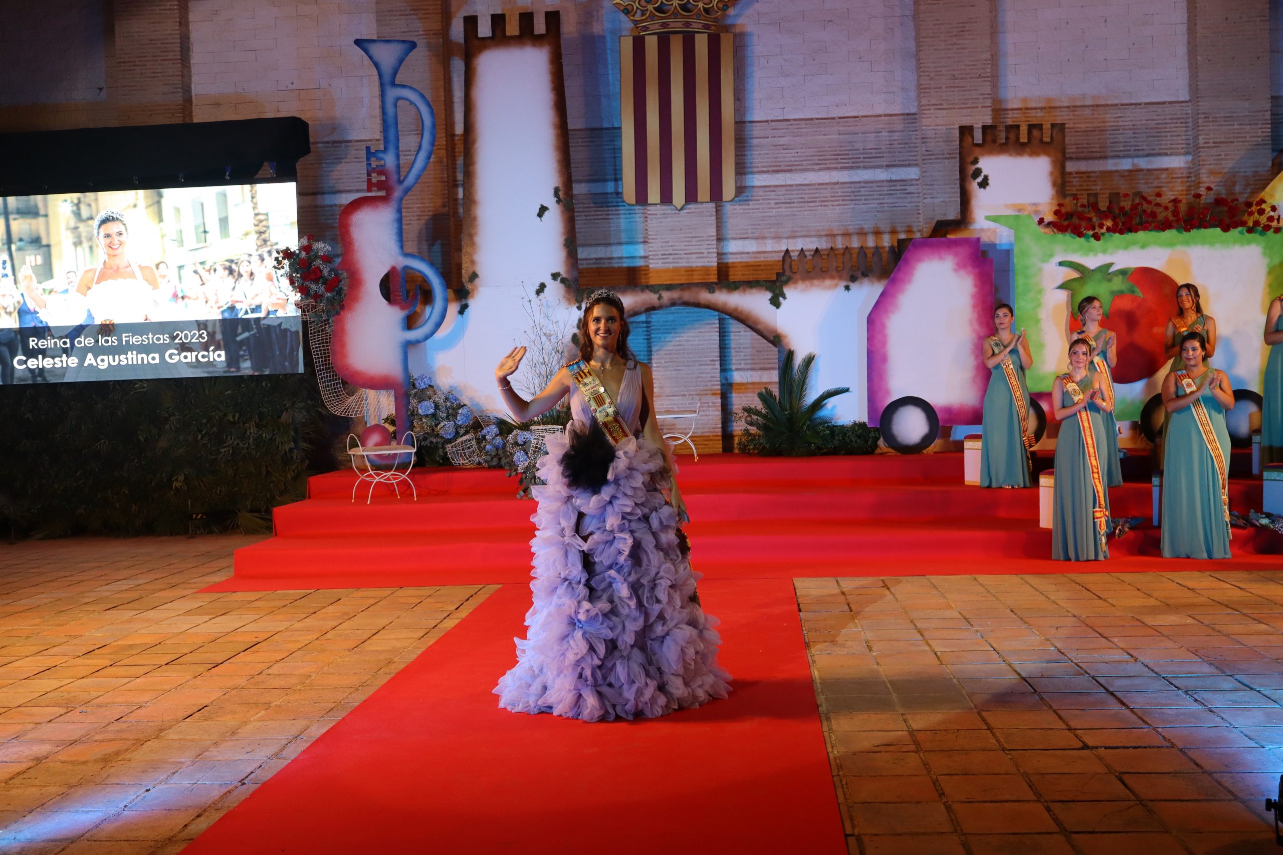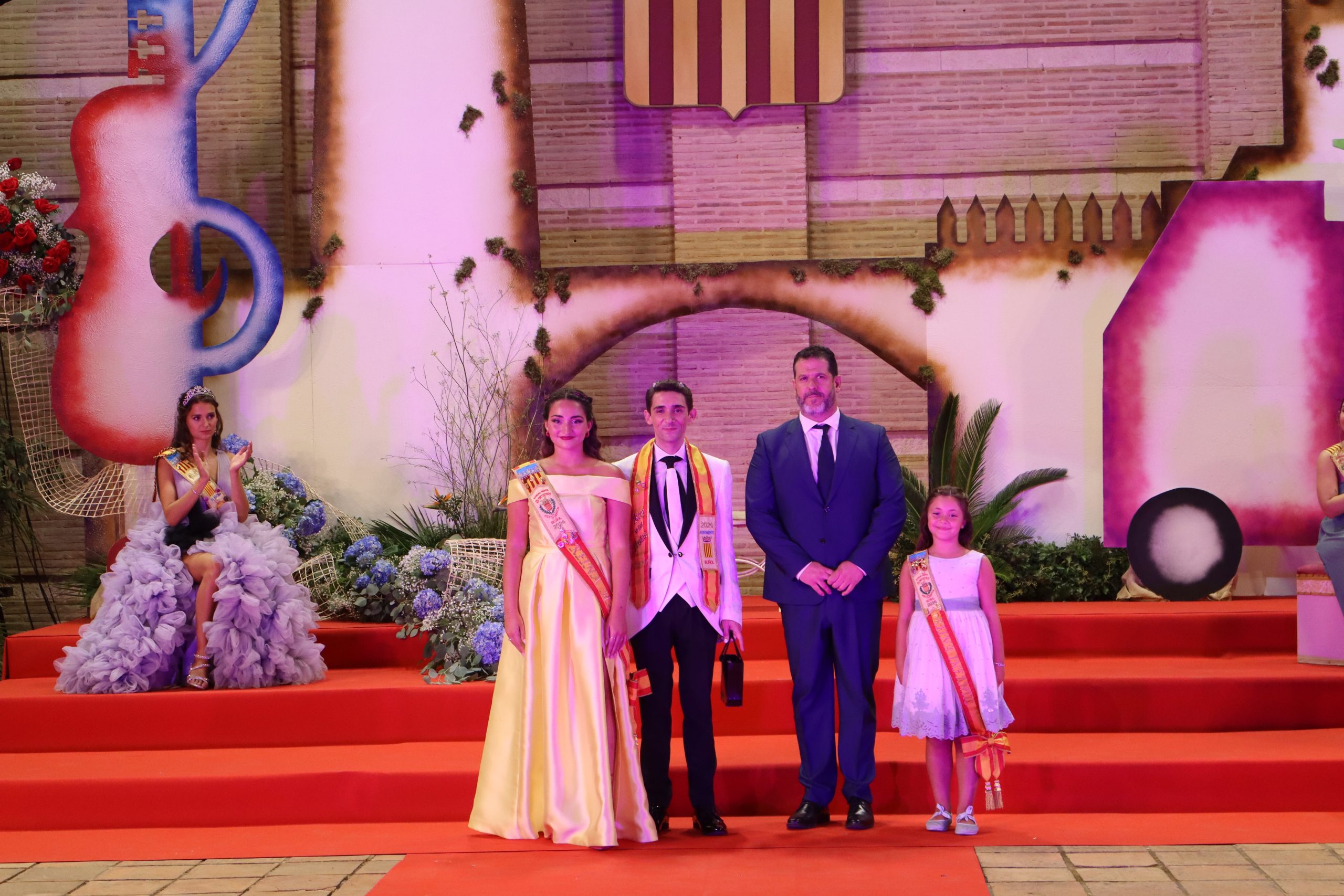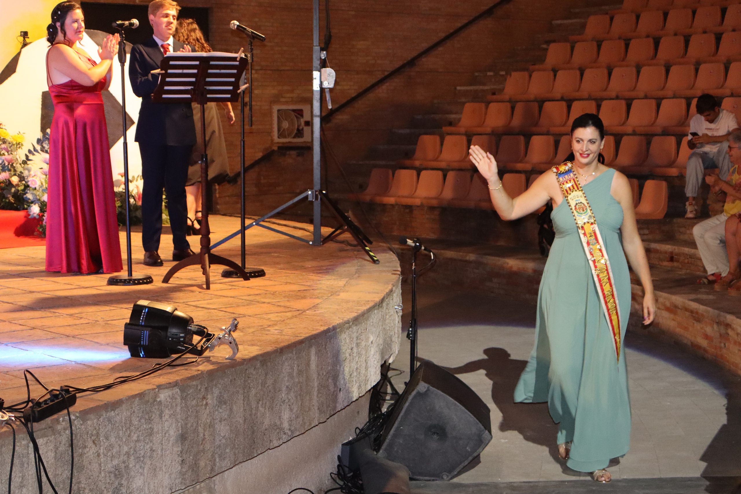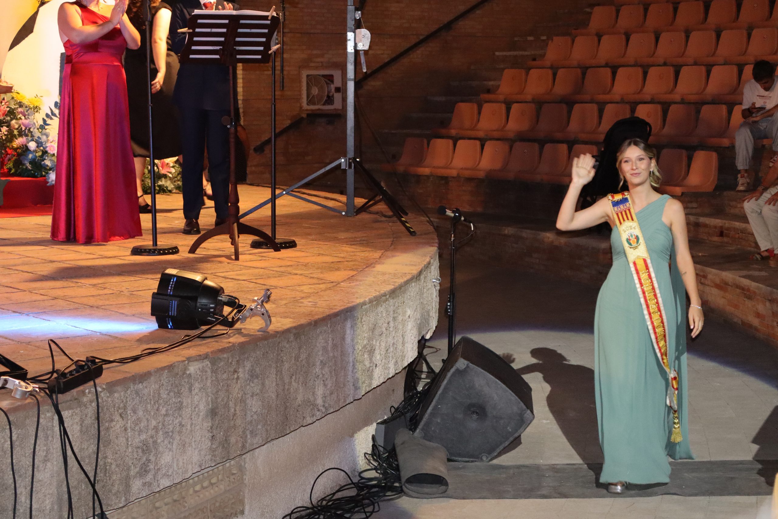 El escenario, se preparó para la ocasión, con los elementos más característicos de las fiestas buñolenses. También ayudó que hubo un maestro de ceremonias que llevó la presentación de manera magistral. Y luego llegaron los momento cumbre. La emotiva despedida de la Reina saliente, Celeste Agustina, que dedicó unas preciosas palabras al abarrotado auditorio. Y luego vino el momento que todos estaban esperando, la bajada por las escaleras de Yeray acompañado de su madre. Fue una bajada larga, intensa, llena de emoción y sentimiento y que estuvo en todo momento acompañada por el aplauso unánime del público. Yeray llegó al escenario y el aplauso se tornó todavía mas intenso y en su cara se veía felicidad y mucha emoción. El protagonista pronunció su primer discurso a las y los vecinos, en el que agradeció el apoyo de su familia y de su eterna amiga Clara Zanón Andrés, pieza fundamental en este paso.