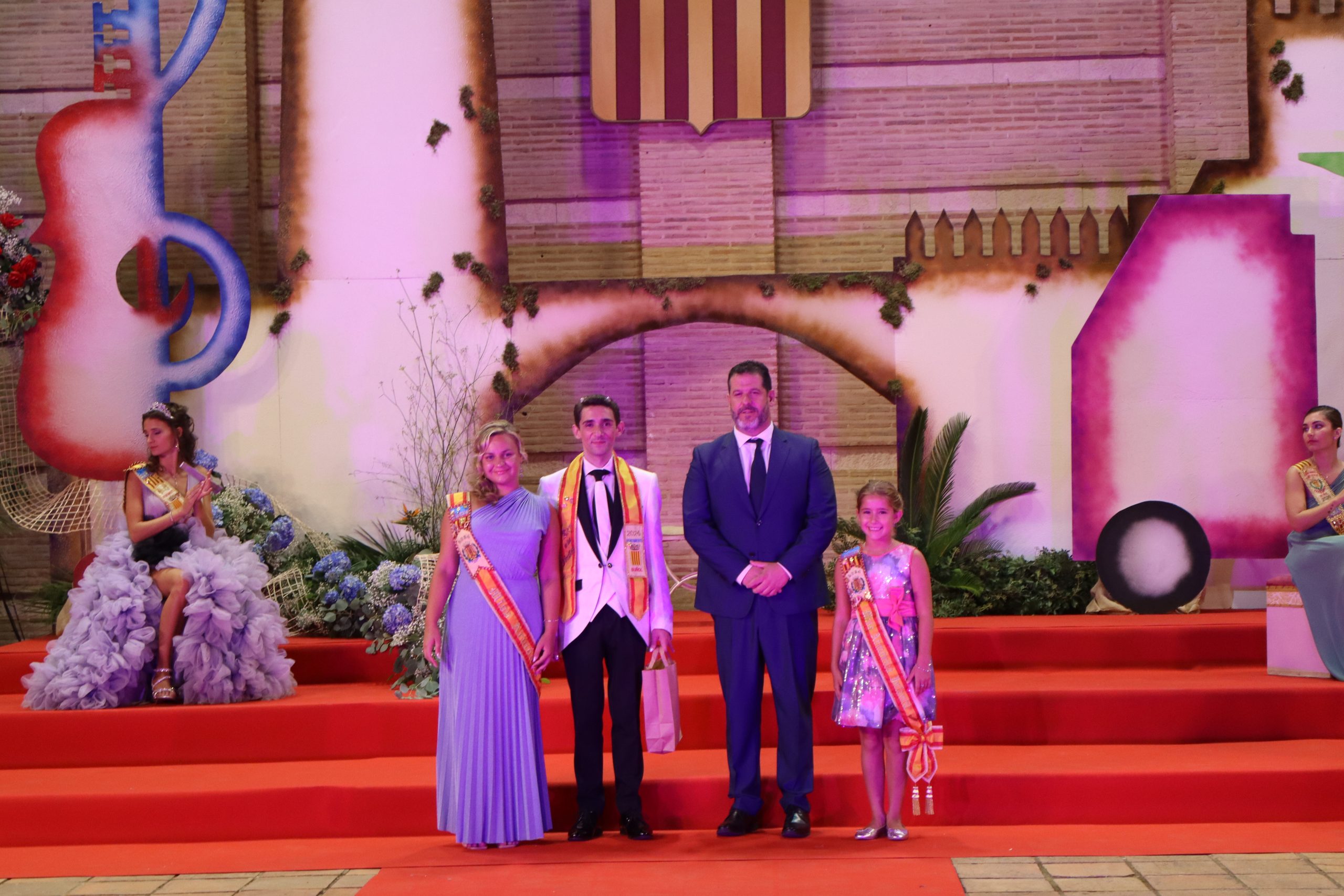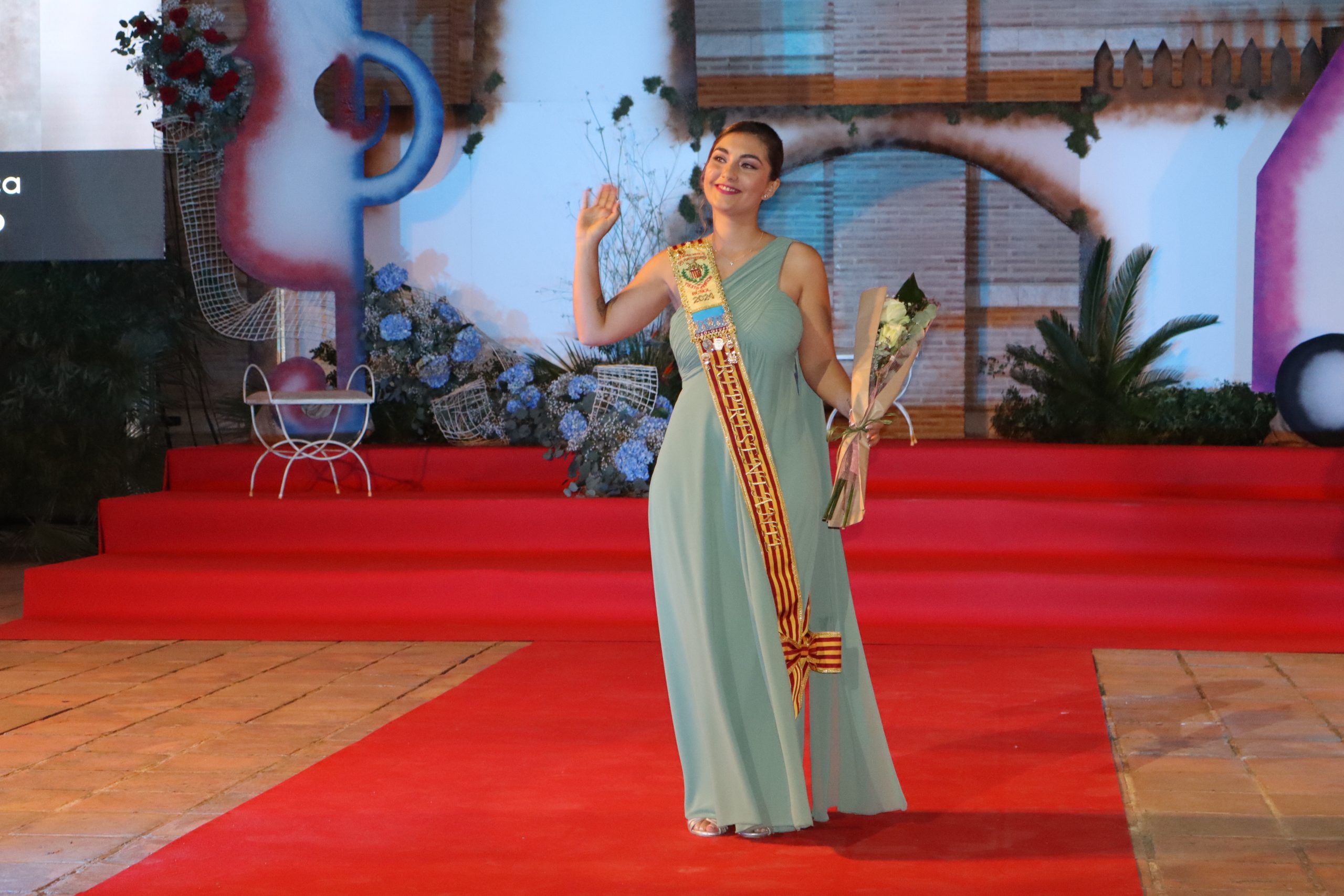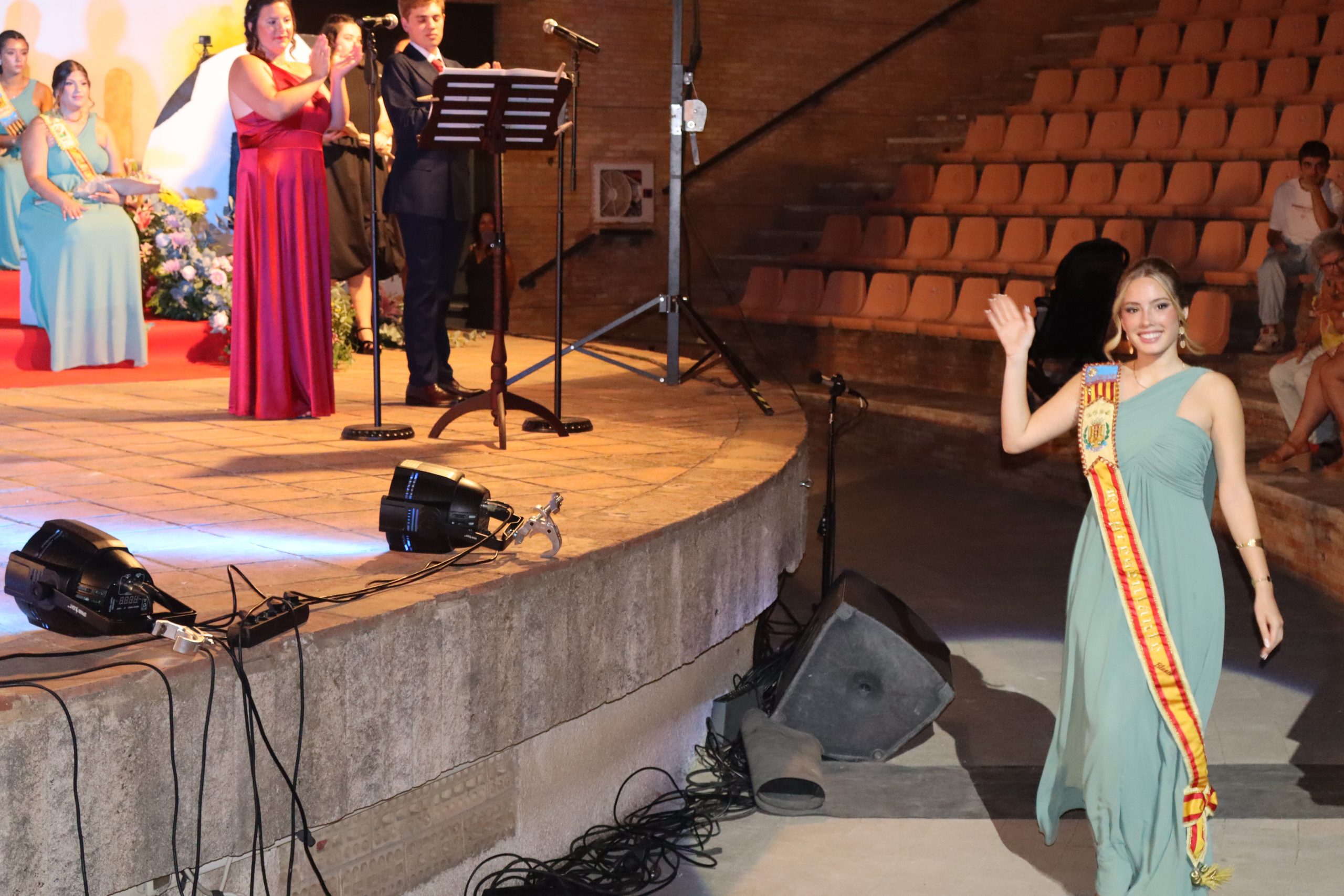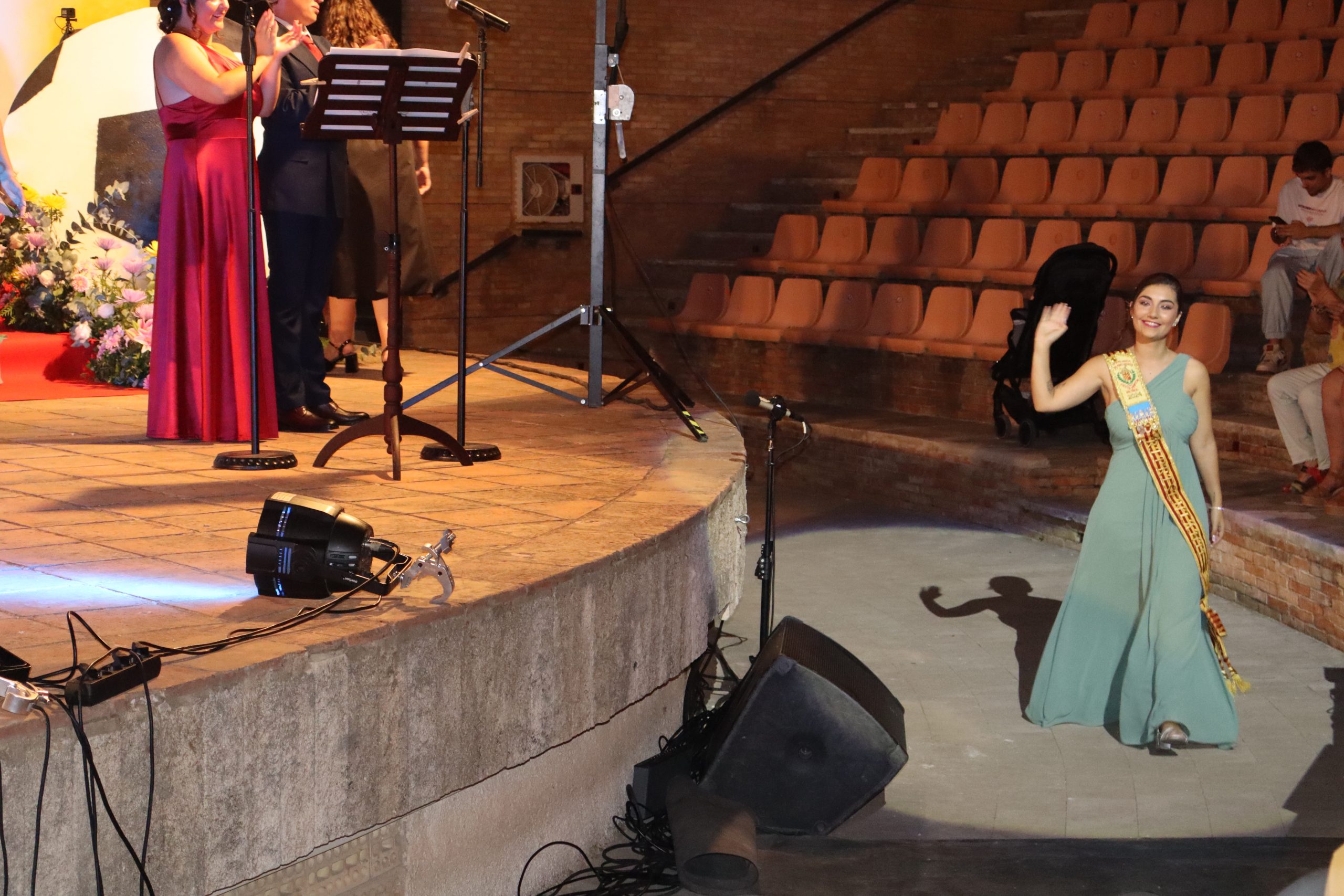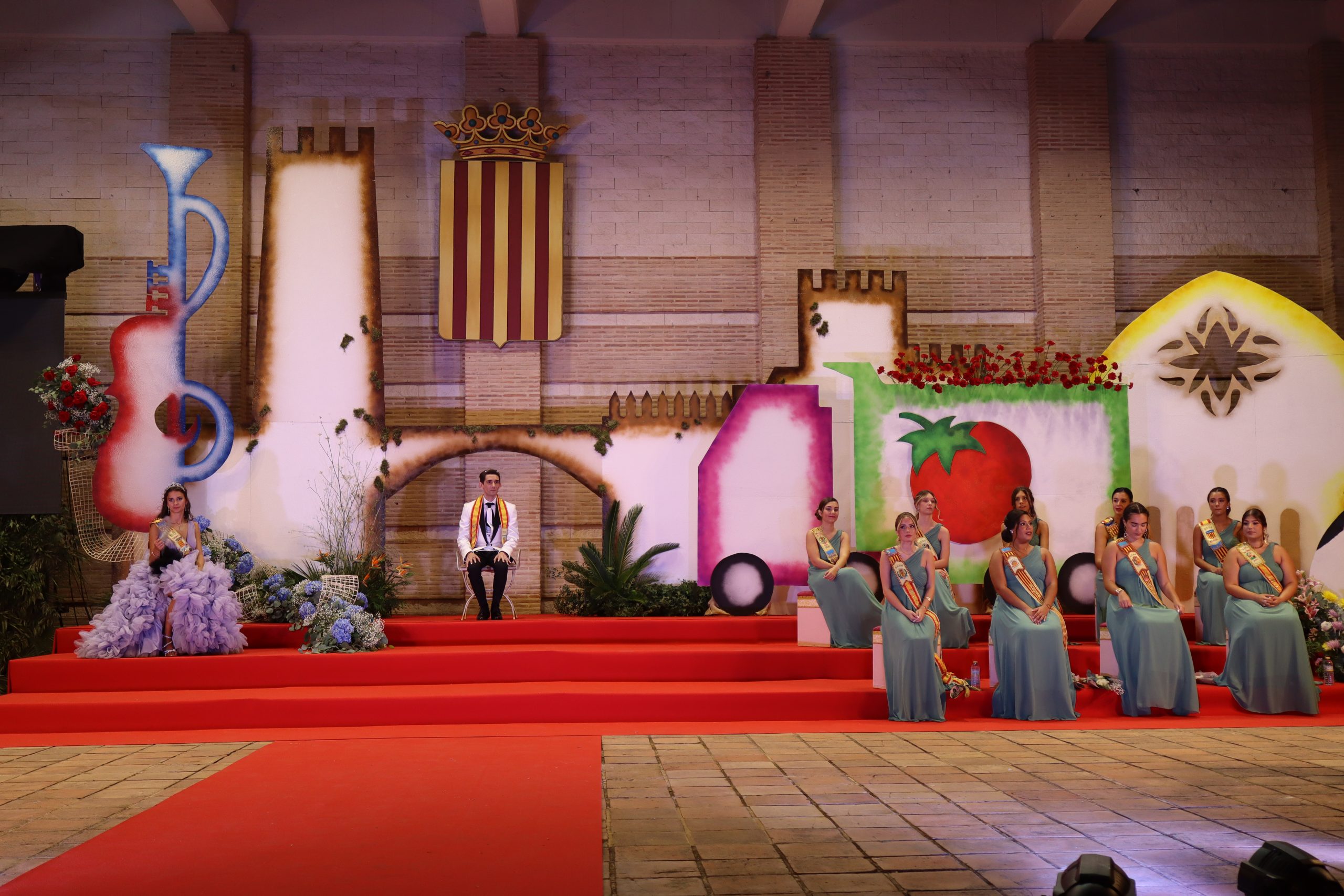 El escenario, se preparó para la ocasión, con los elementos más característicos de las fiestas buñolenses. También ayudó que hubo un maestro de ceremonias que llevó la presentación de manera magistral. Y luego llegaron los momento cumbre. La emotiva despedida de la Reina saliente, Celeste Agustina, que dedicó unas preciosas palabras al abarrotado auditorio. Y luego vino el momento que todos estaban esperando, la bajada por las escaleras de Yeray acompañado de su madre. Fue una bajada larga, intensa, llena de emoción y sentimiento y que estuvo en todo momento acompañada por el aplauso unánime del público. Yeray llegó al escenario y el aplauso se tornó todavía mas intenso y en su cara se veía felicidad y mucha emoción. El protagonista pronunció su primer discurso a las y los vecinos, en el que agradeció el apoyo de su familia y de su eterna amiga Clara Zanón Andrés, pieza fundamental en este paso.