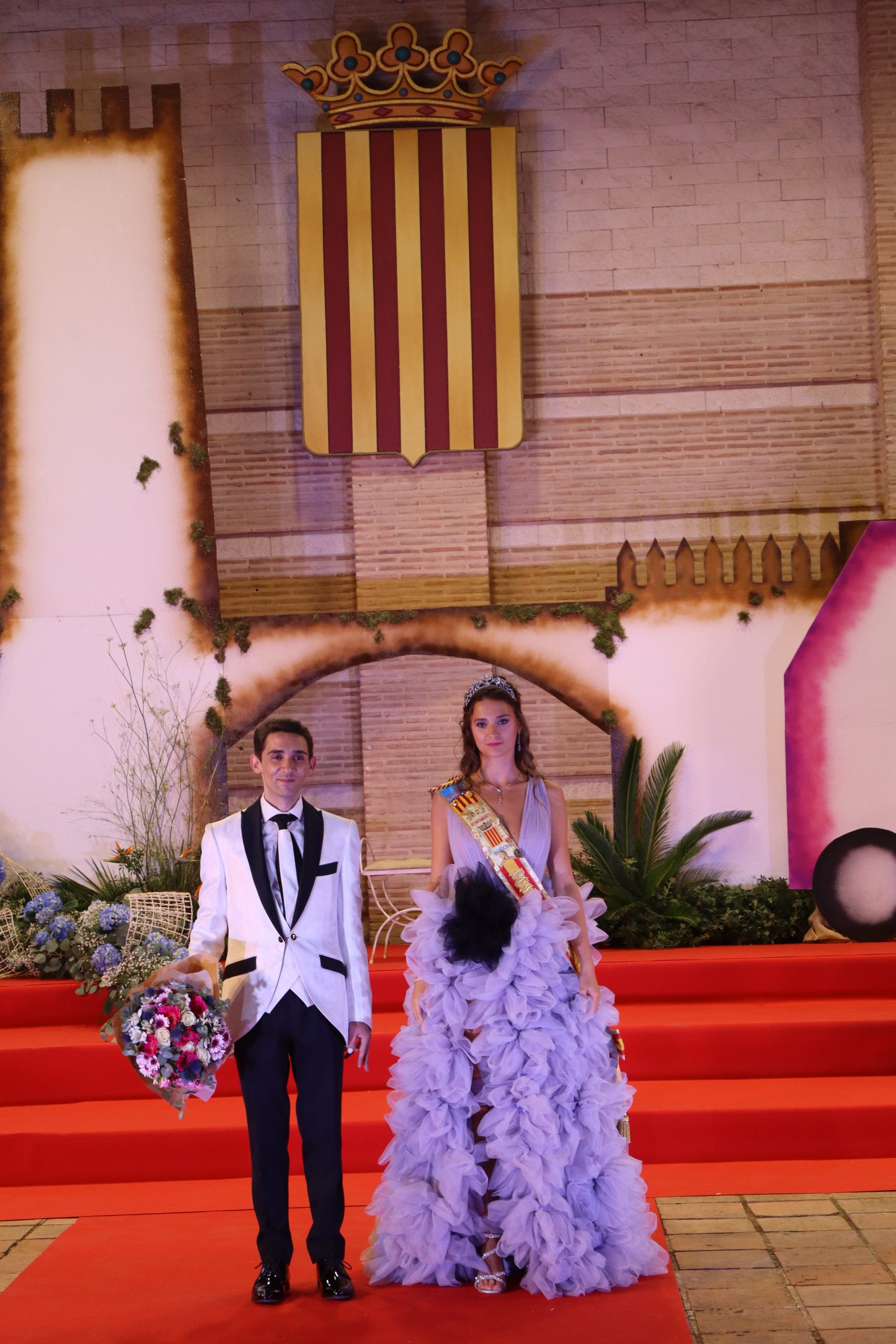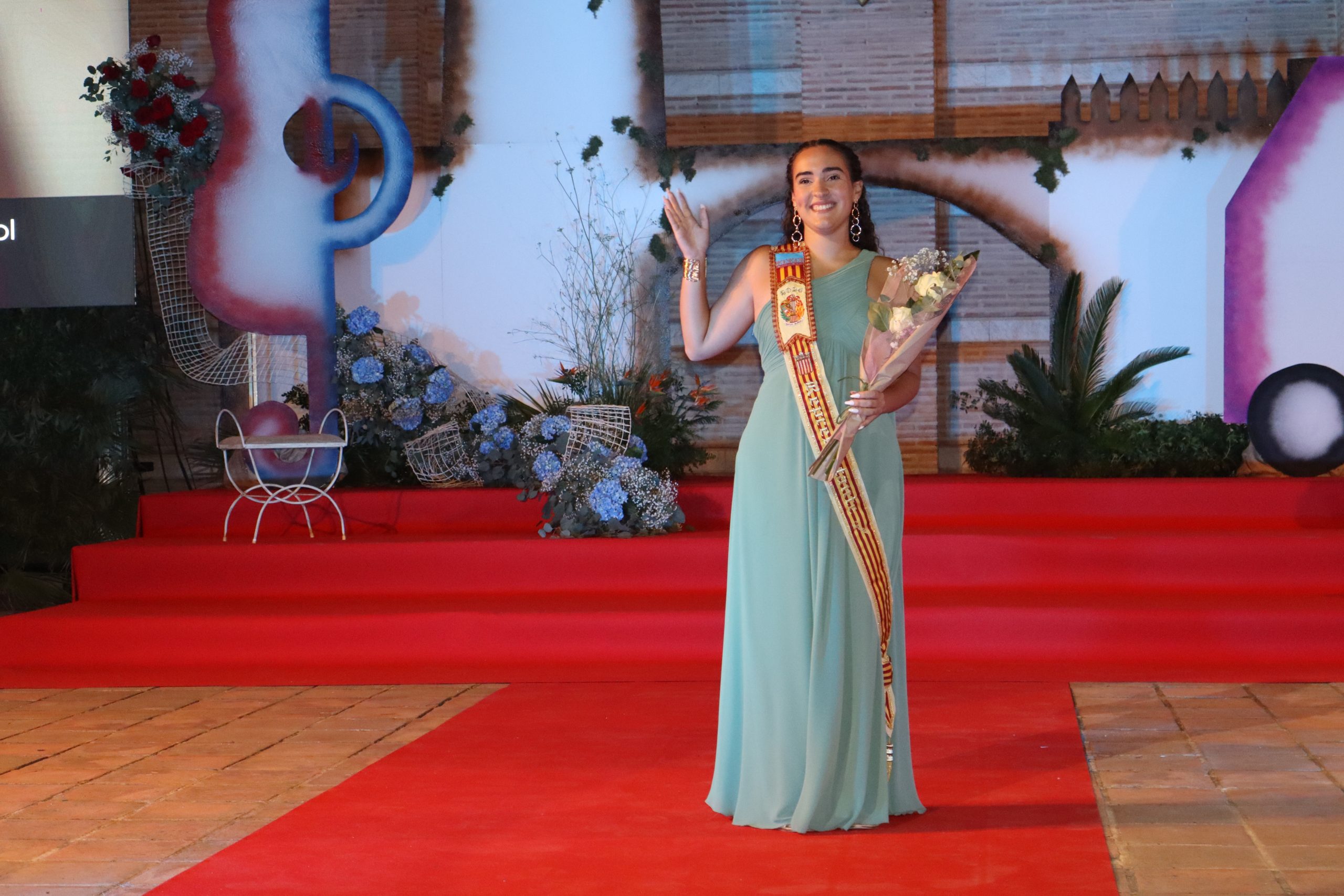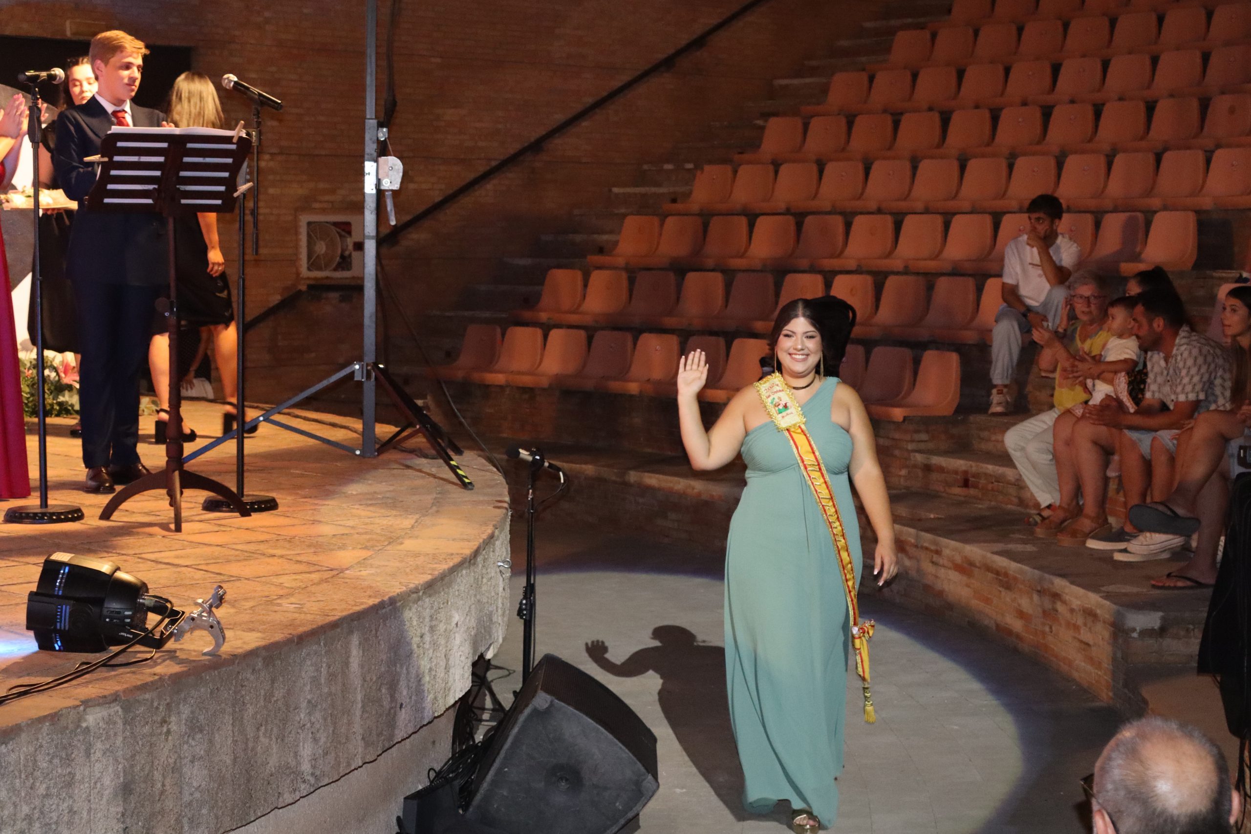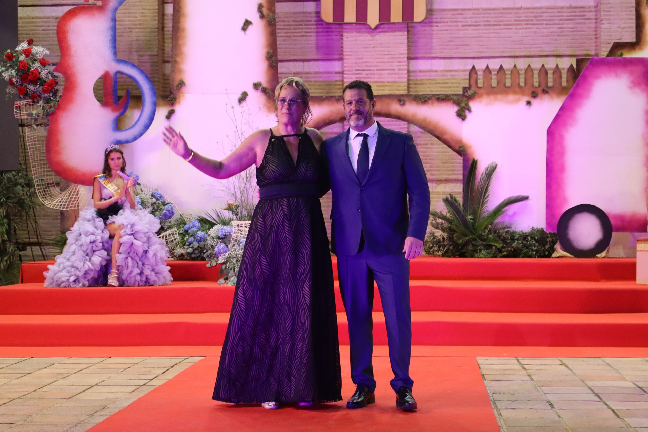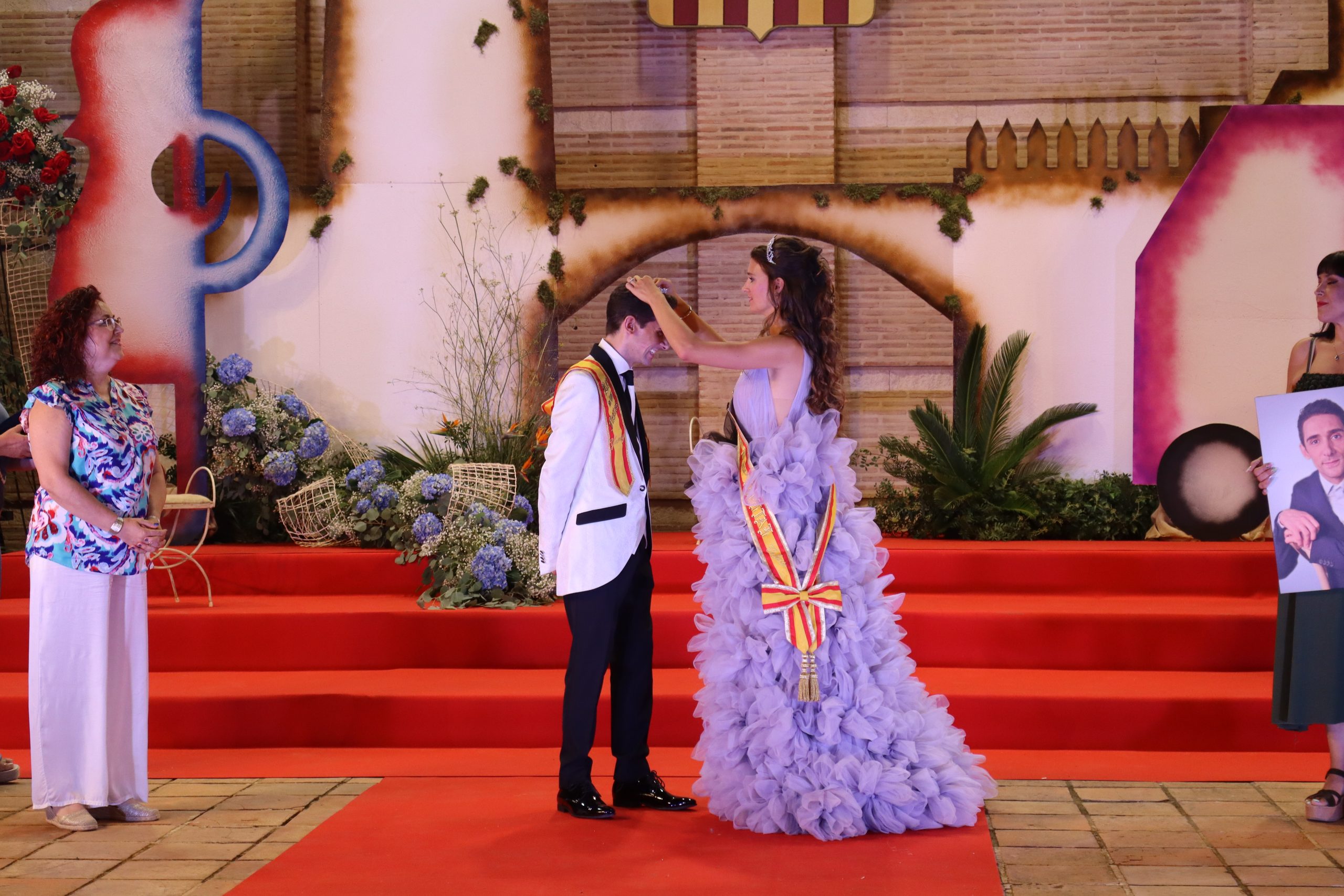El escenario, se preparó para la ocasión, con los elementos más característicos de las fiestas buñolenses. También ayudó que hubo un maestro de ceremonias que llevó la presentación de manera magistral. Y luego llegaron los momento cumbre. La emotiva despedida de la Reina saliente, Celeste Agustina, que dedicó unas preciosas palabras al abarrotado auditorio. Y luego vino el momento que todos estaban esperando, la bajada por las escaleras de Yeray acompañado de su madre. Fue una bajada larga, intensa, llena de emoción y sentimiento y que estuvo en todo momento acompañada por el aplauso unánime del público. Yeray llegó al escenario y el aplauso se tornó todavía mas intenso y en su cara se veía felicidad y mucha emoción. El protagonista pronunció su primer discurso a las y los vecinos, en el que agradeció el apoyo de su familia y de su eterna amiga Clara Zanón Andrés, pieza fundamental en este paso.