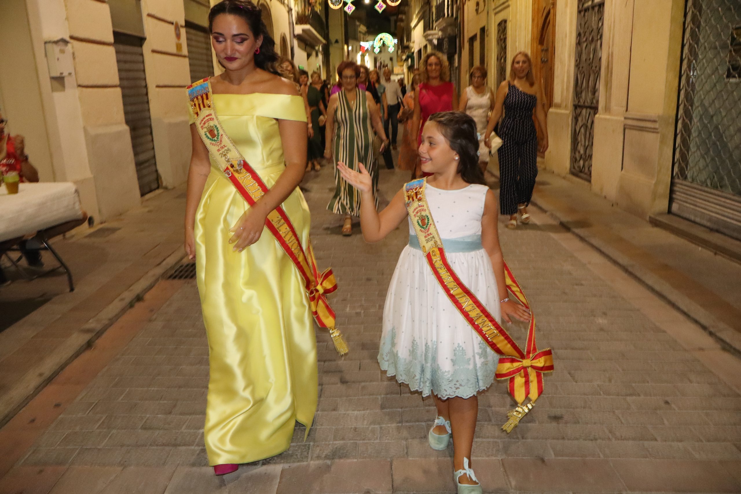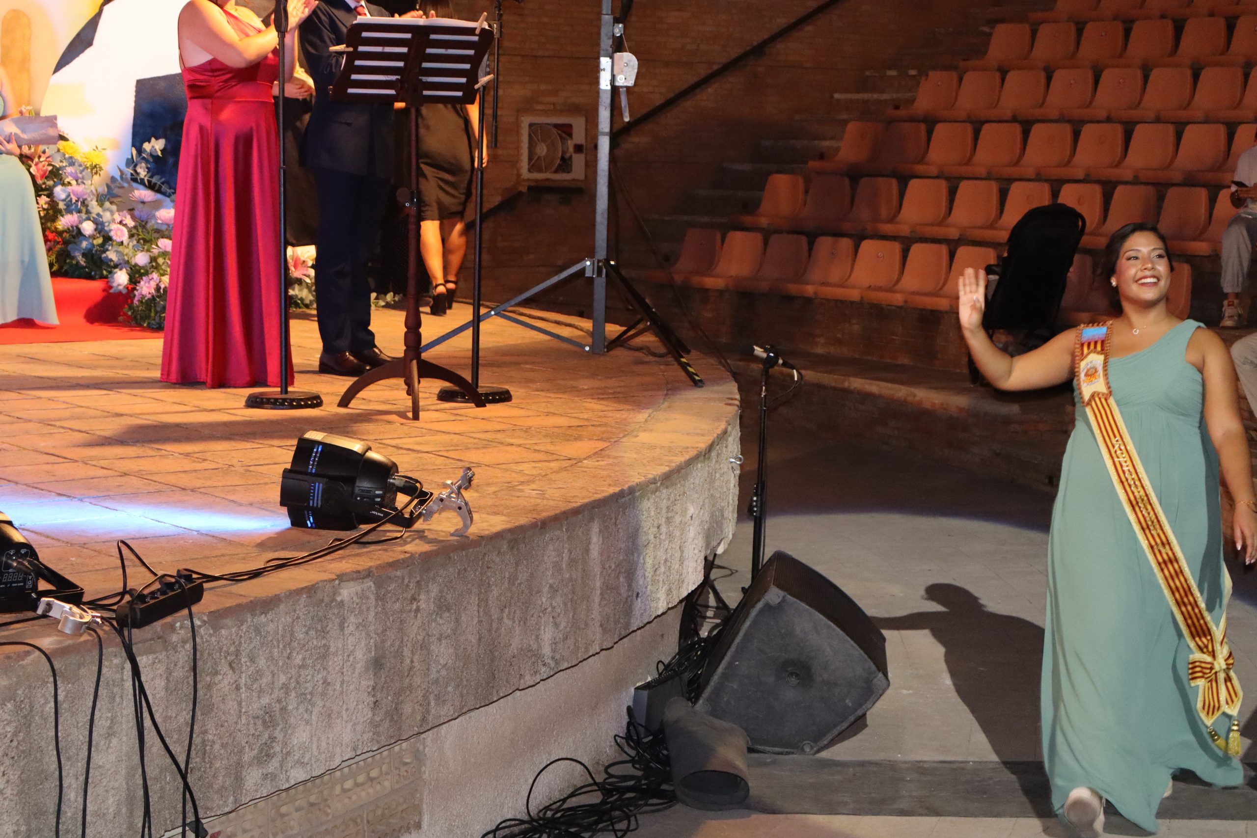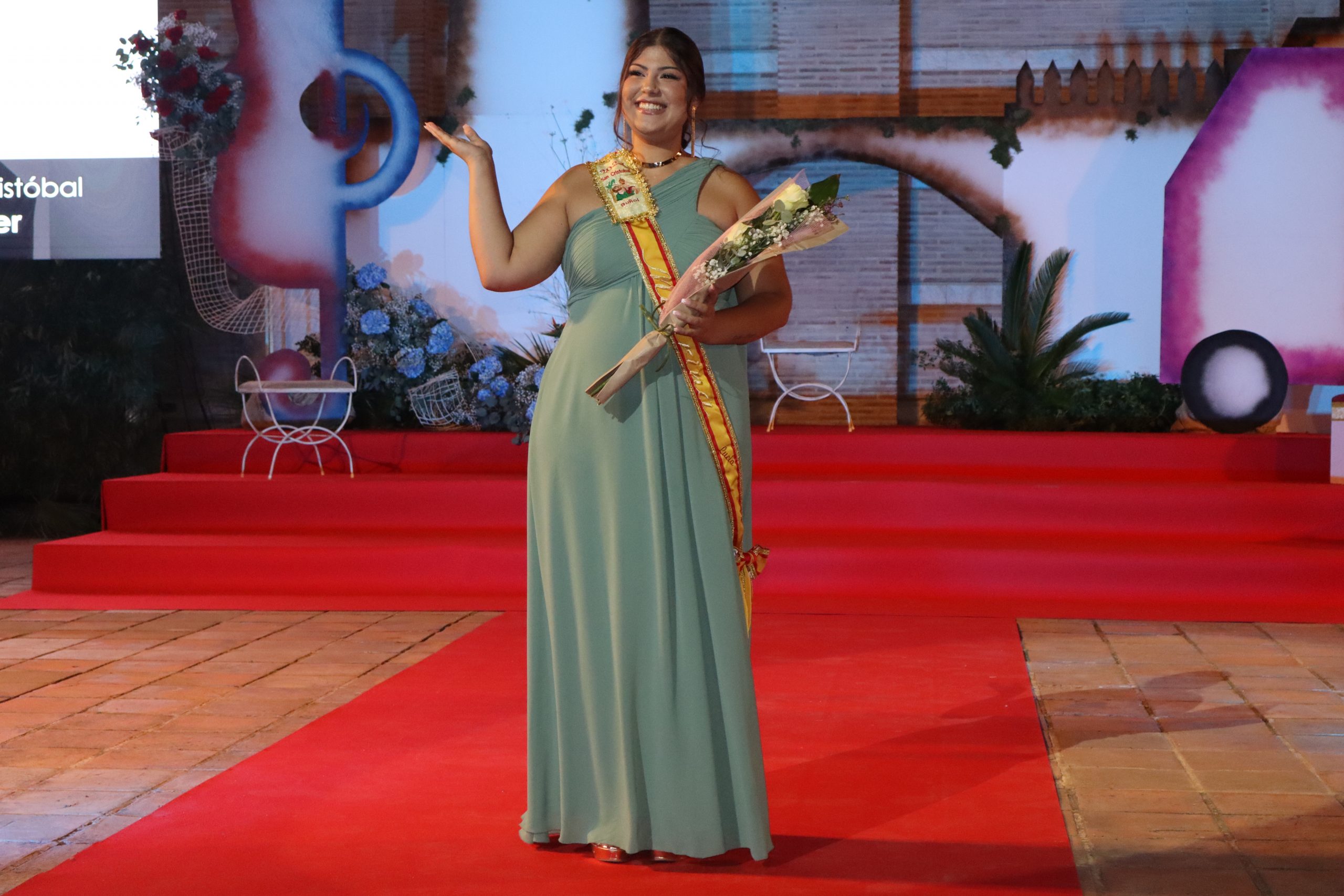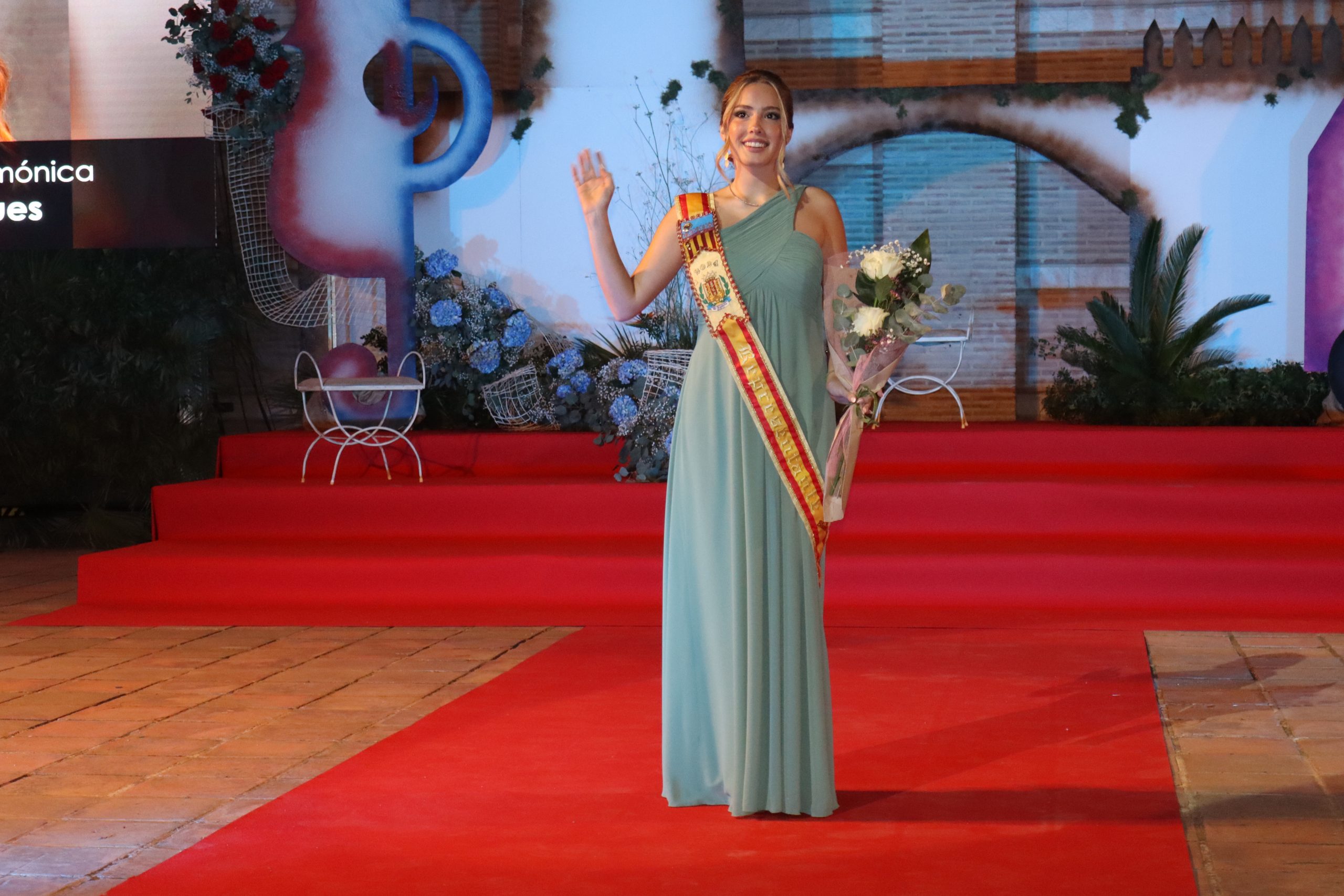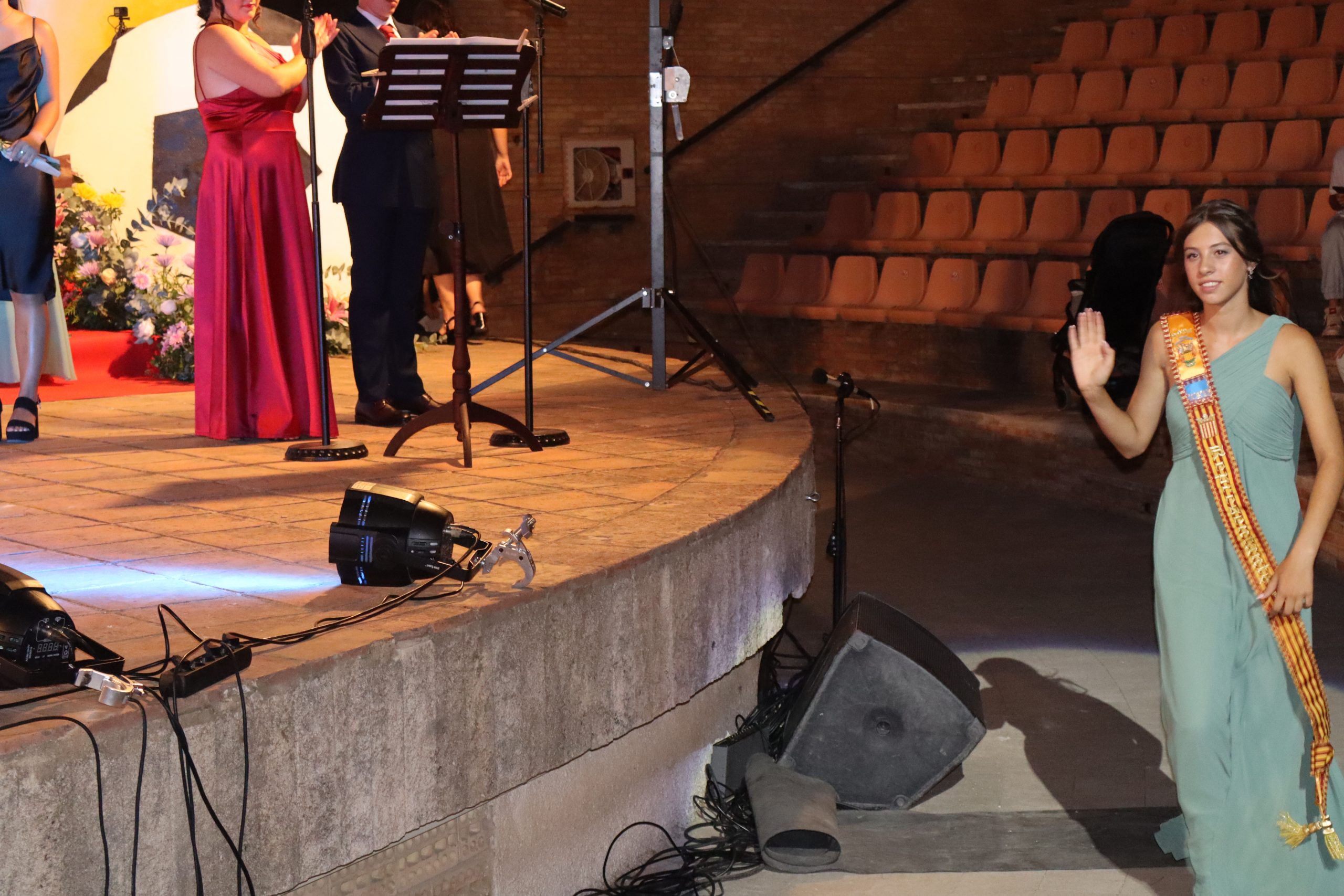 El escenario, se preparó para la ocasión, con los elementos más característicos de las fiestas buñolenses. También ayudó que hubo un maestro de ceremonias que llevó la presentación de manera magistral. Y luego llegaron los momento cumbre. La emotiva despedida de la Reina saliente, Celeste Agustina, que dedicó unas preciosas palabras al abarrotado auditorio. Y luego vino el momento que todos estaban esperando, la bajada por las escaleras de Yeray acompañado de su madre. Fue una bajada larga, intensa, llena de emoción y sentimiento y que estuvo en todo momento acompañada por el aplauso unánime del público. Yeray llegó al escenario y el aplauso se tornó todavía mas intenso y en su cara se veía felicidad y mucha emoción. El protagonista pronunció su primer discurso a las y los vecinos, en el que agradeció el apoyo de su familia y de su eterna amiga Clara Zanón Andrés, pieza fundamental en este paso.