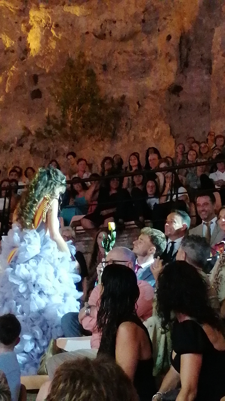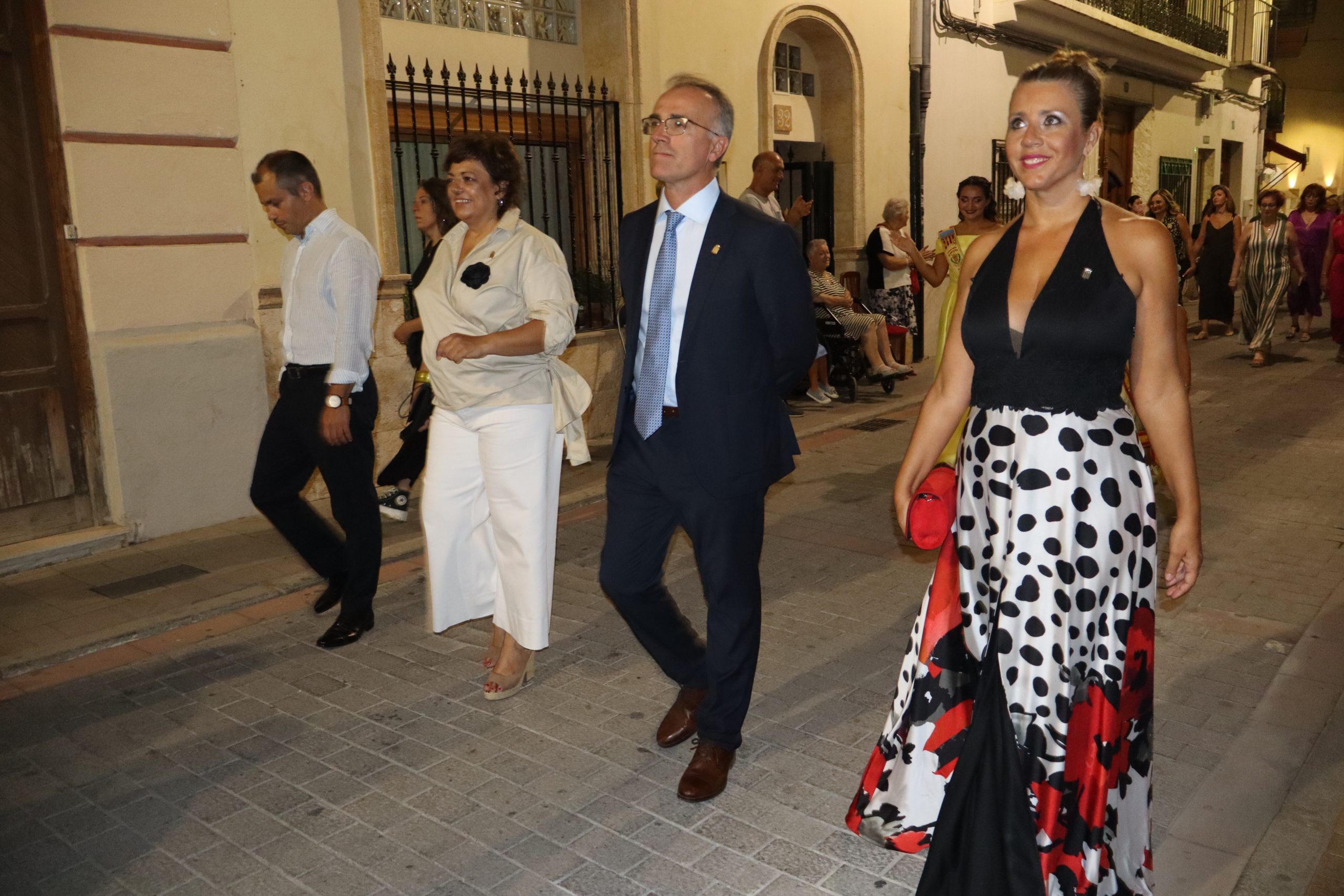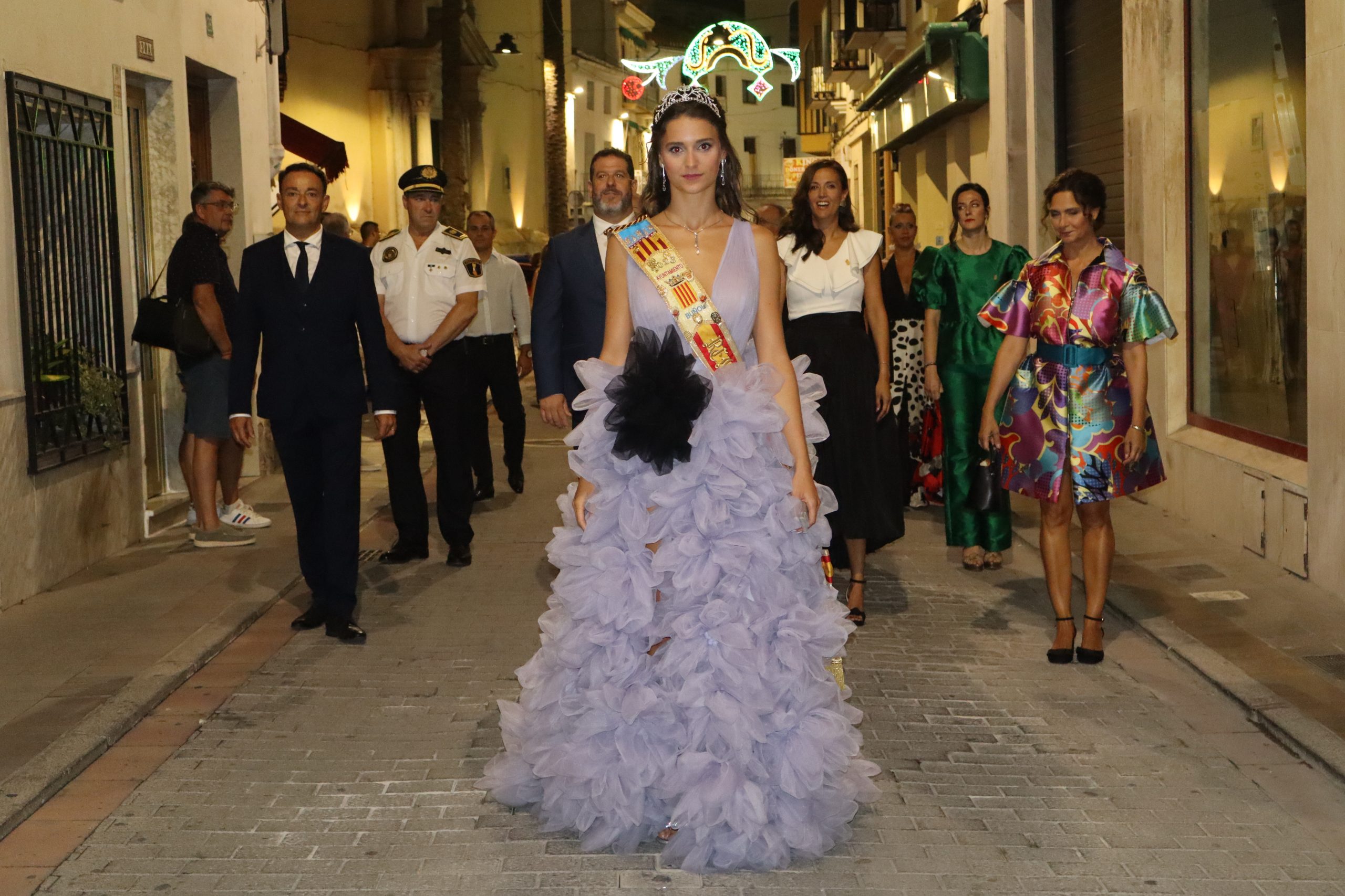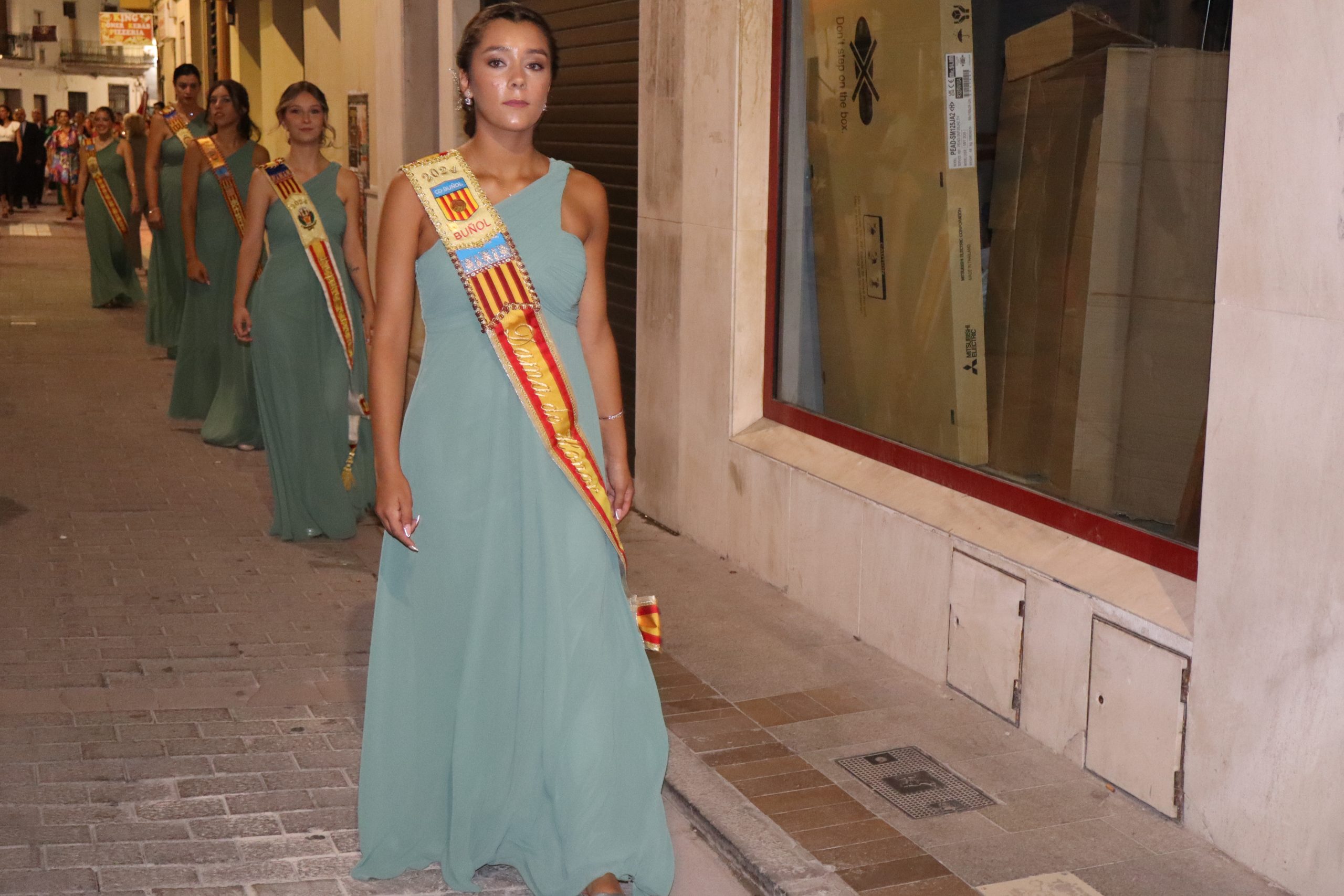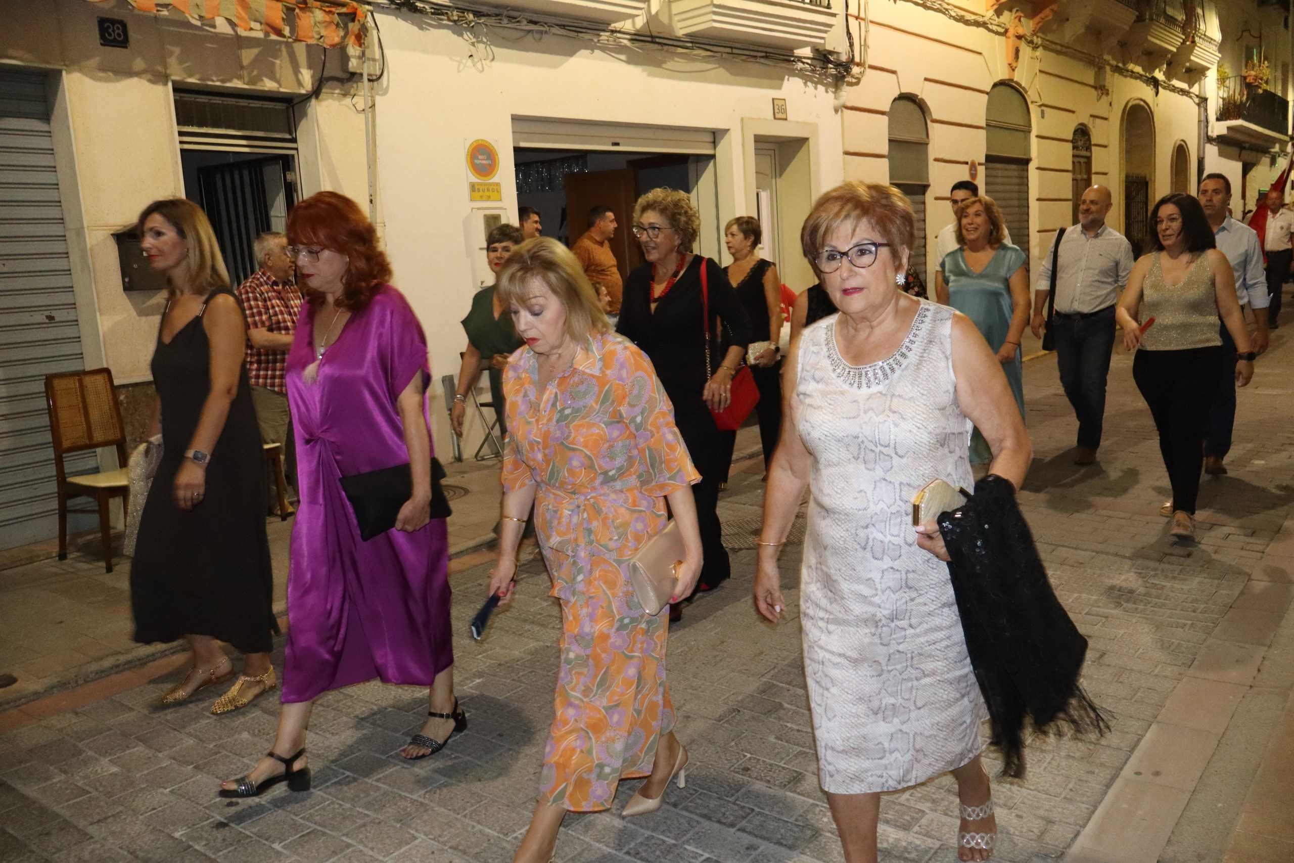 El escenario, se preparó para la ocasión, con los elementos más característicos de las fiestas buñolenses. También ayudó que hubo un maestro de ceremonias que llevó la presentación de manera magistral. Y luego llegaron los momento cumbre. La emotiva despedida de la Reina saliente, Celeste Agustina, que dedicó unas preciosas palabras al abarrotado auditorio. Y luego vino el momento que todos estaban esperando, la bajada por las escaleras de Yeray acompañado de su madre. Fue una bajada larga, intensa, llena de emoción y sentimiento y que estuvo en todo momento acompañada por el aplauso unánime del público. Yeray llegó al escenario y el aplauso se tornó todavía mas intenso y en su cara se veía felicidad y mucha emoción. El protagonista pronunció su primer discurso a las y los vecinos, en el que agradeció el apoyo de su familia y de su eterna amiga Clara Zanón Andrés, pieza fundamental en este paso.